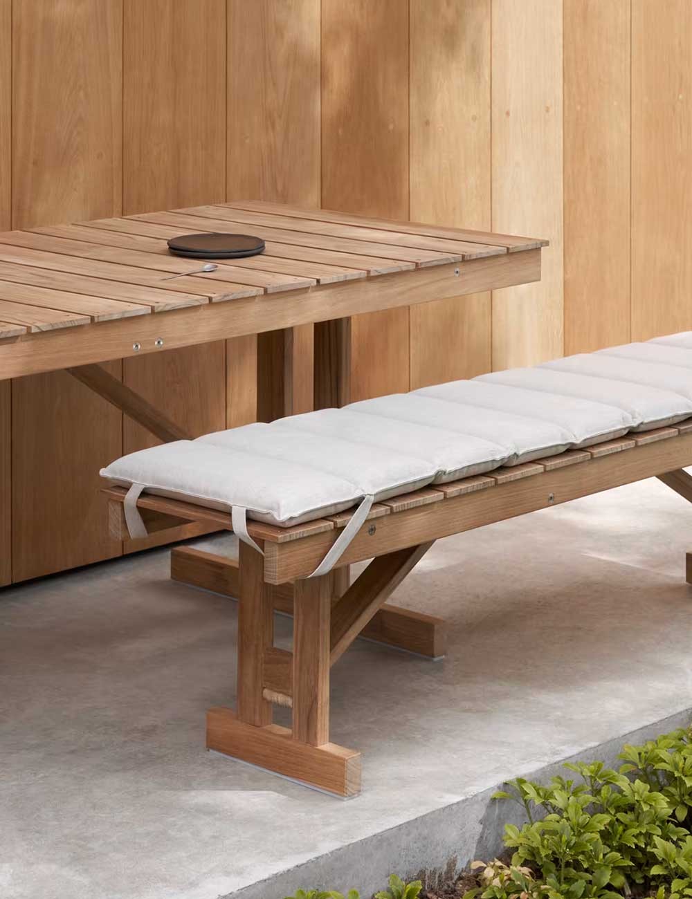 Riscoperti da Carl Hansen & Søn, il tavolo e la panca da esterno dell'iconico designer sono stati adattati alla sensibilità moderna, pur rimanendo fedeli allo spirito del design originale. Su una robusta ma elegante struttura in legno, le doghe grafiche creano un piano resistente e decorativo, perfetto per improvvisate riunioni all'aperto.
