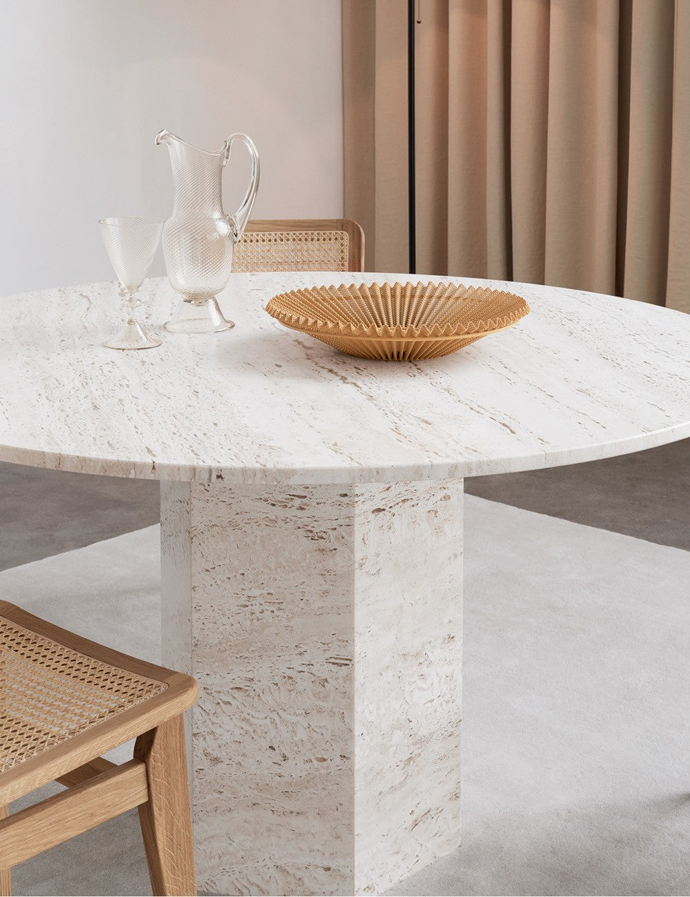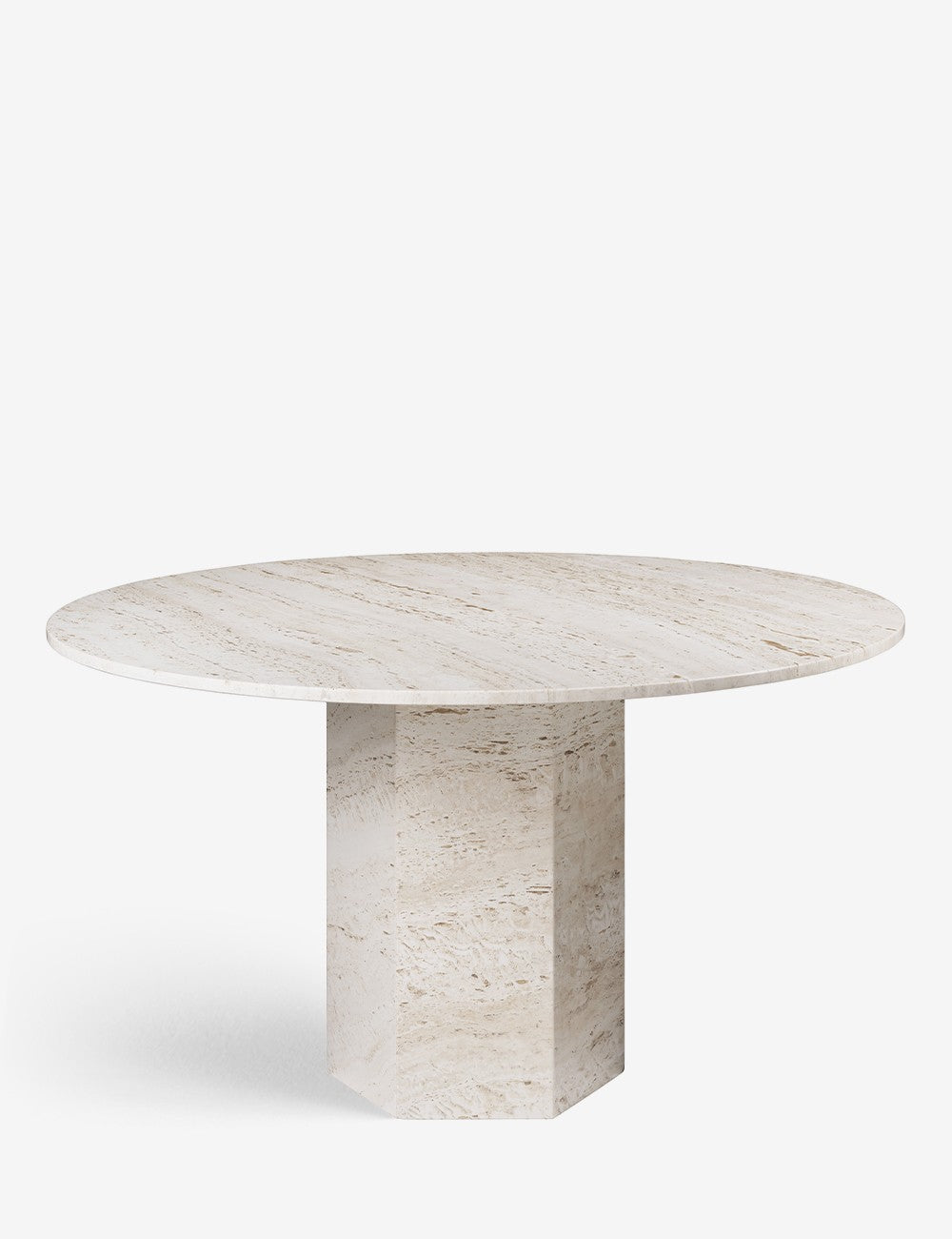 La forma monolitica di Epic enfatizza la bellezza naturale delle venature vivaci e della consistenza del marmo travertino.