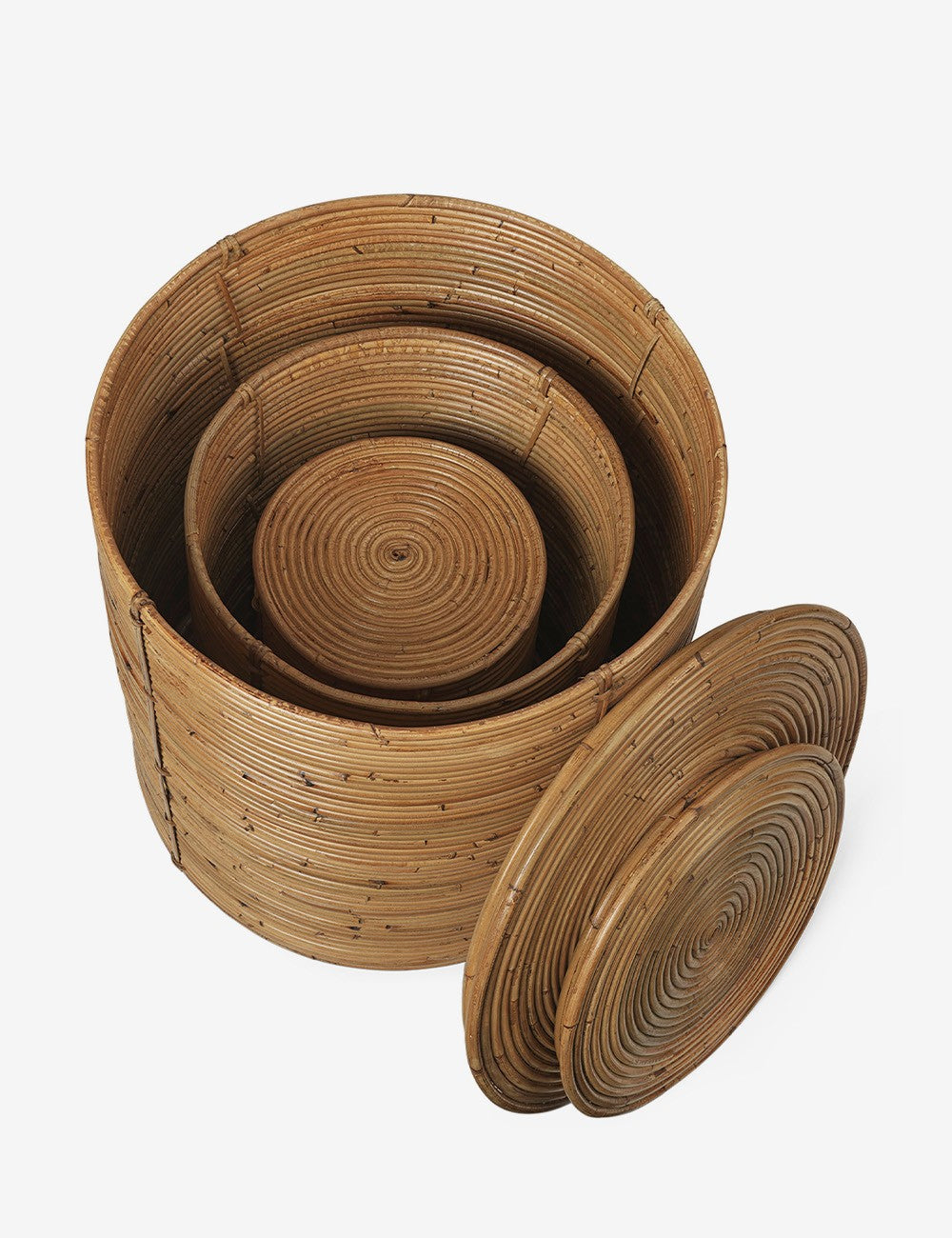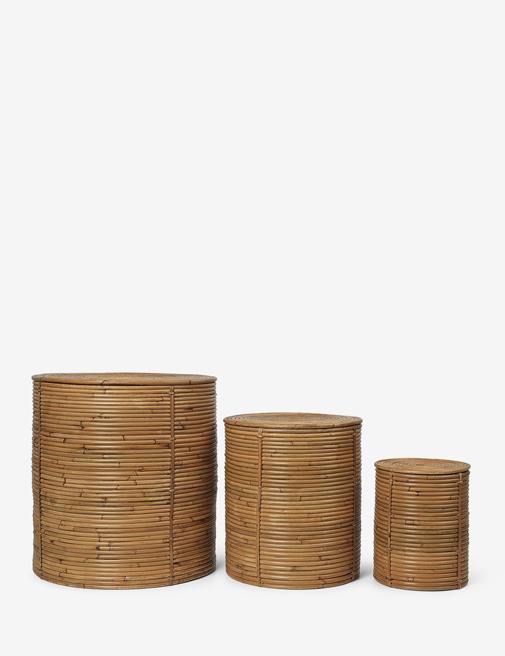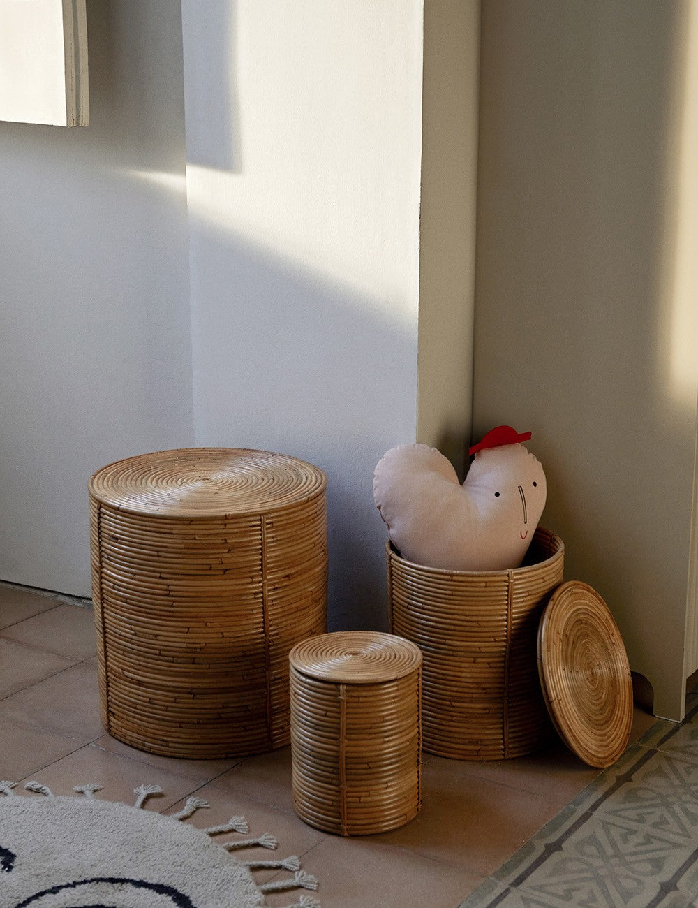 Column Storage di Ferm Living è una serie di cestini portaoggetti pratici e funzionali, realizzati in rattan naturale.
