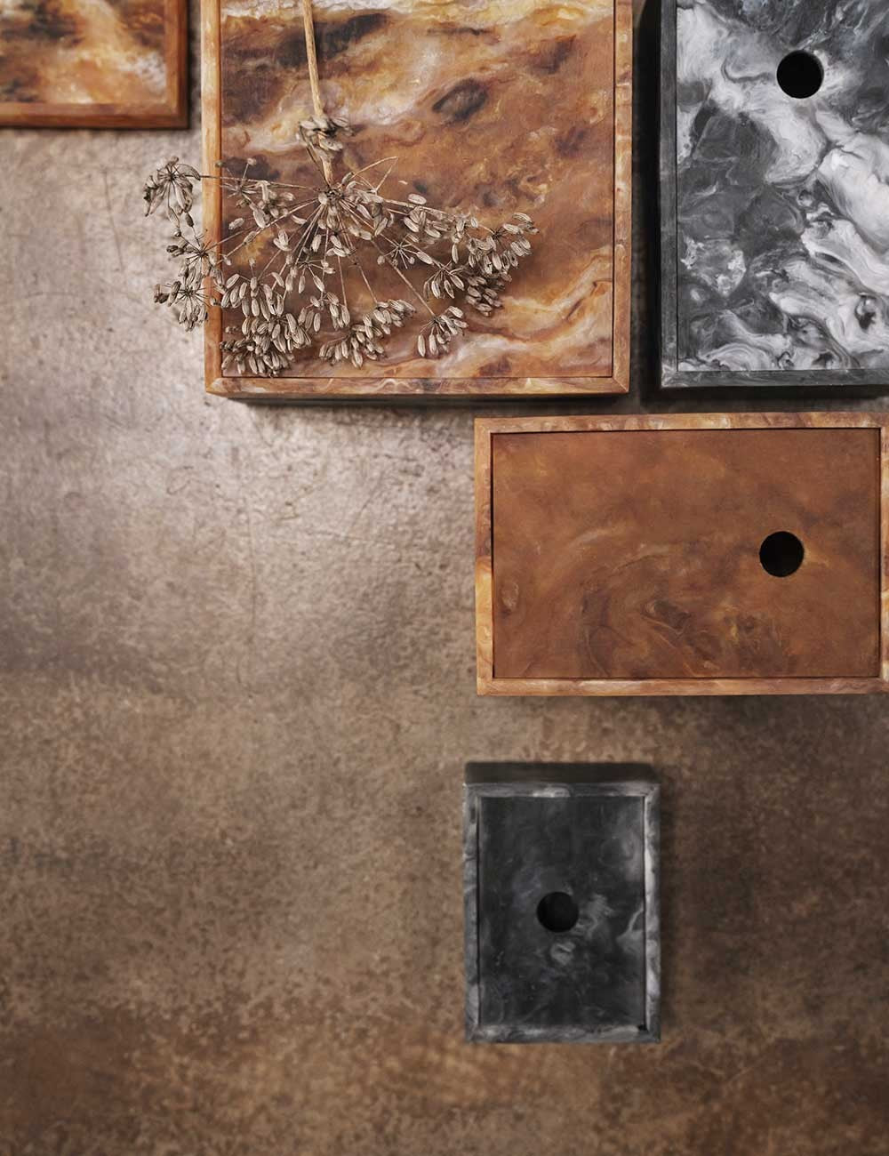 Realizzato in una miscela di resine, il vassoio Mist presenta forme fluide e vorticose e tonalità eteree, rendendo ogni vassoio davvero unico.