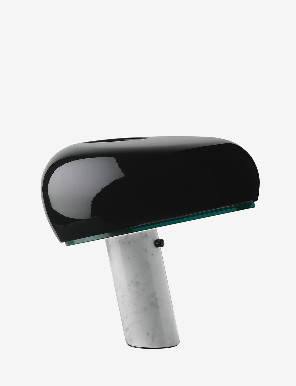 Snoopy unisce una base in marmo bianco a un paralume in metallo smaltato lucido e a uno spesso diffusore in vetro che fornisce una piacevole luce ambientale.