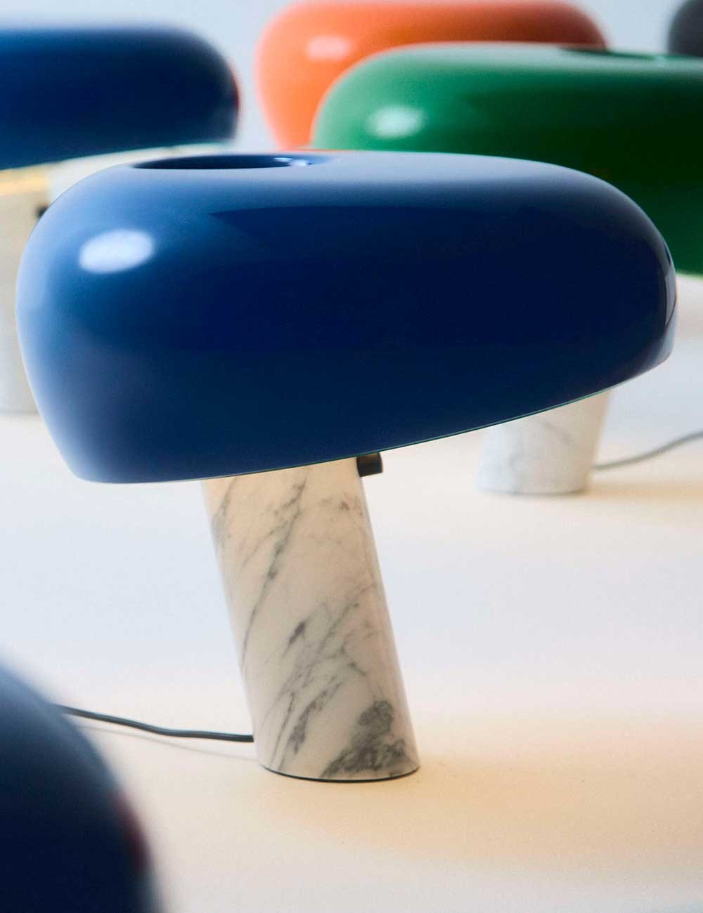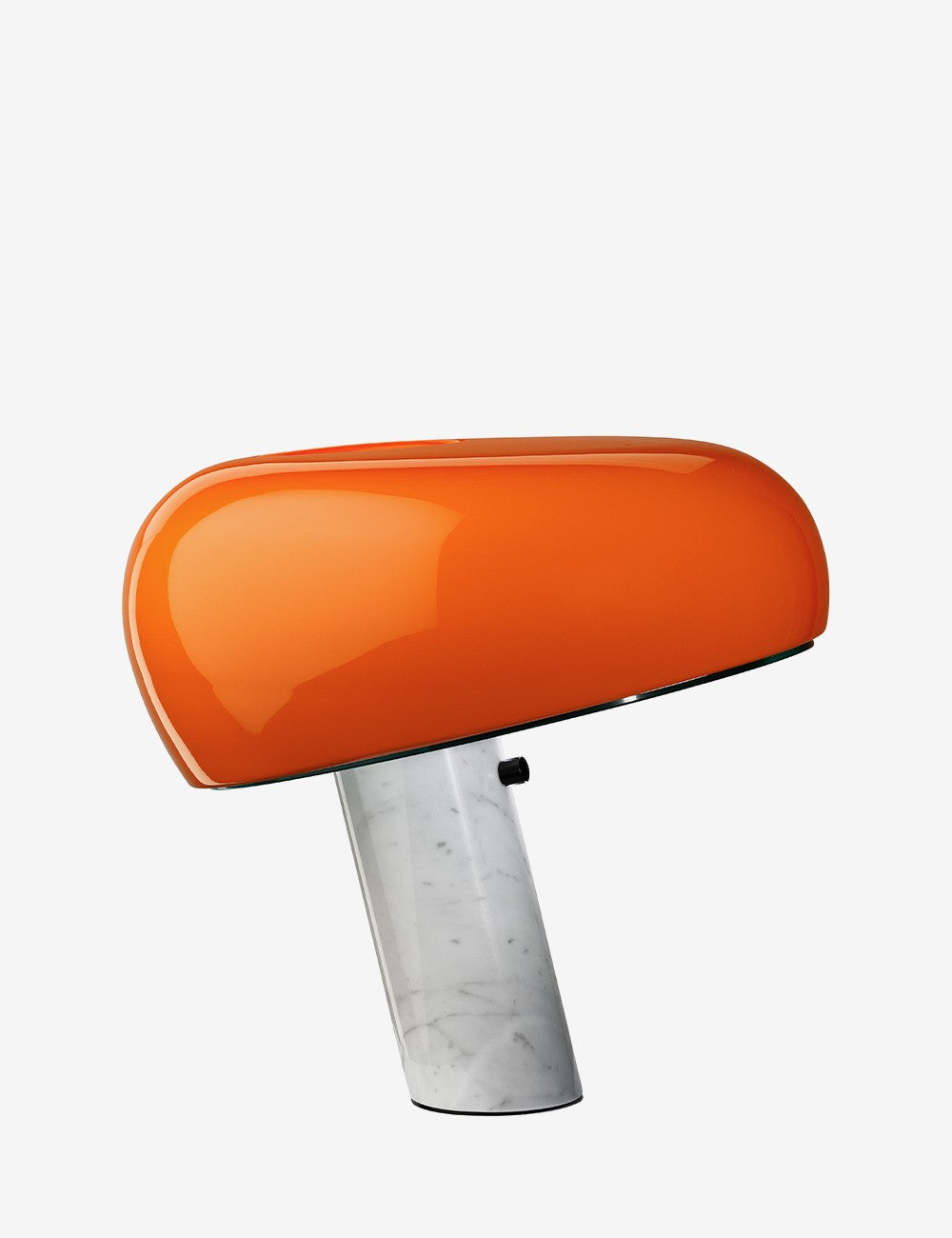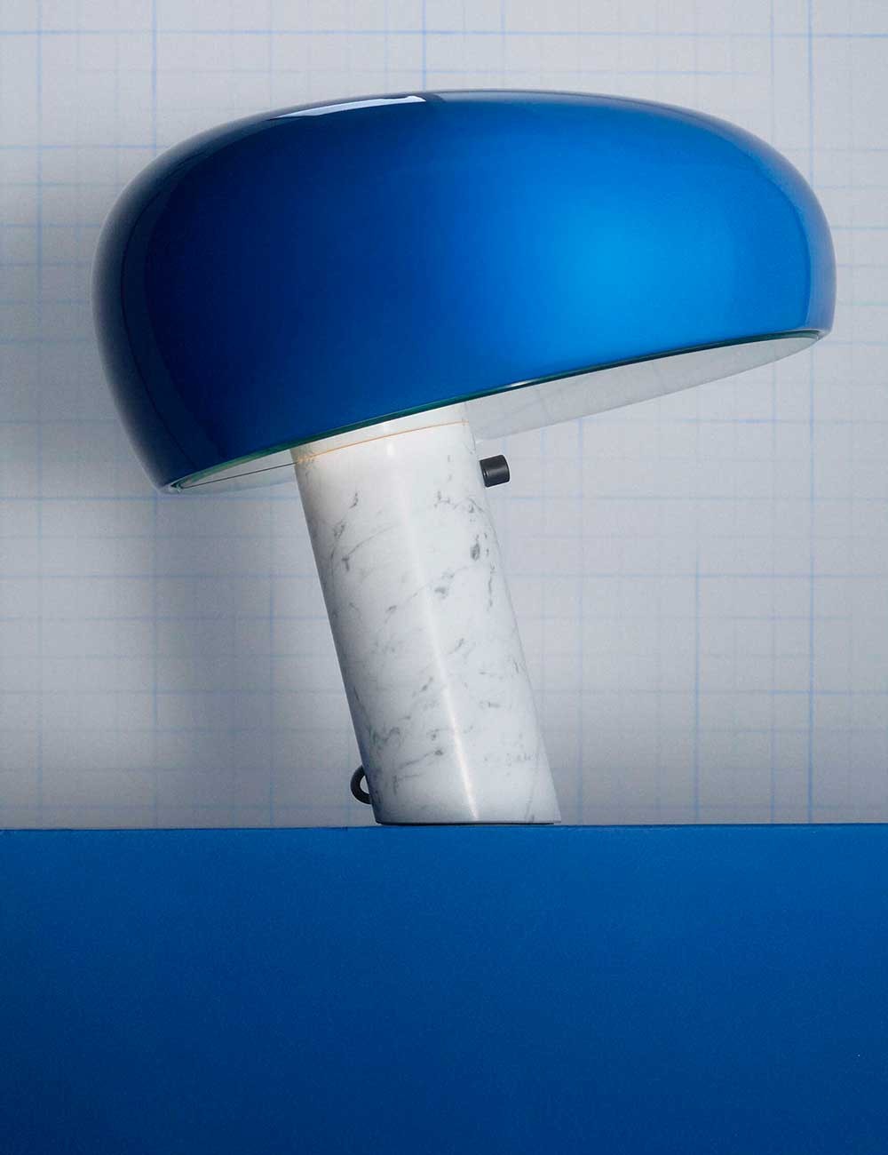 Snoopy unisce una base in marmo bianco a un paralume in metallo smaltato lucido e a uno spesso diffusore in vetro che fornisce una piacevole luce ambientale.