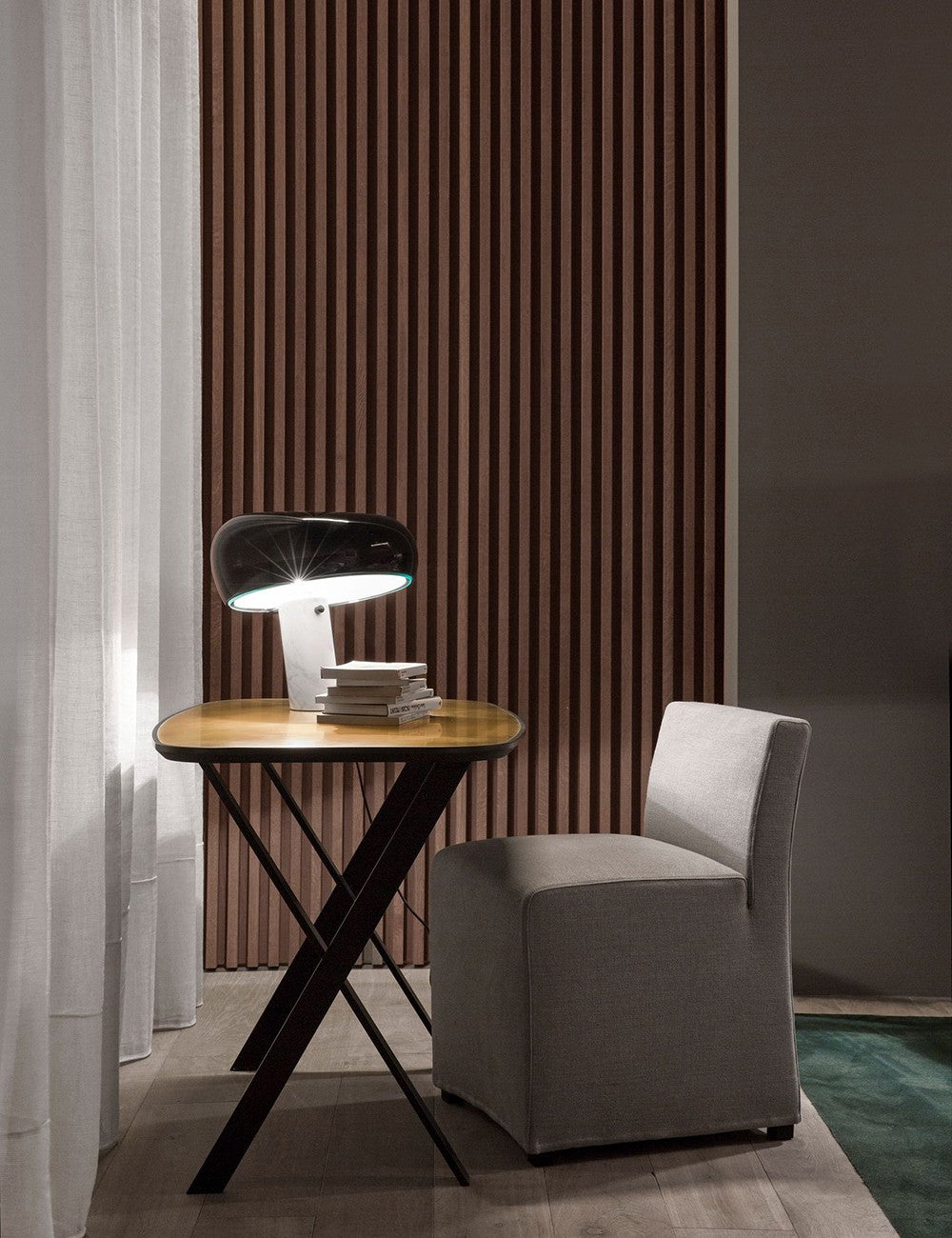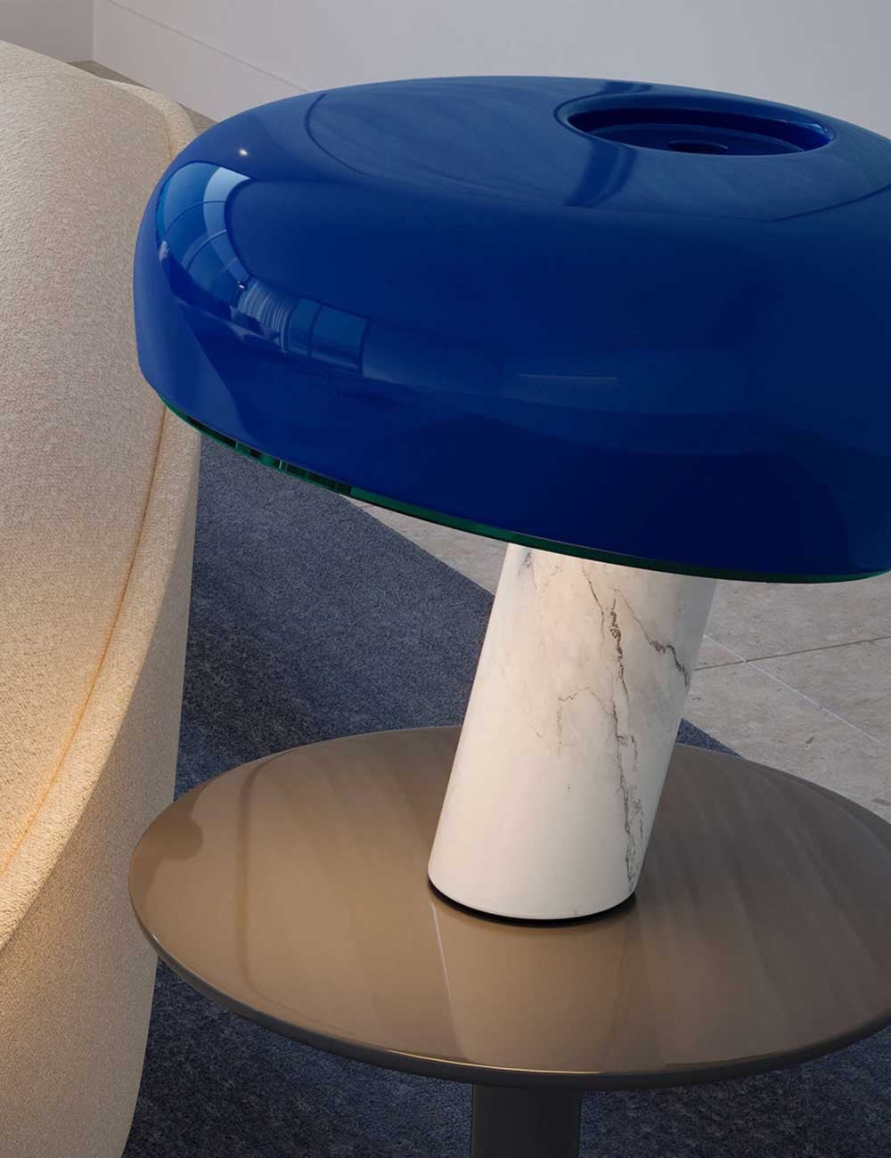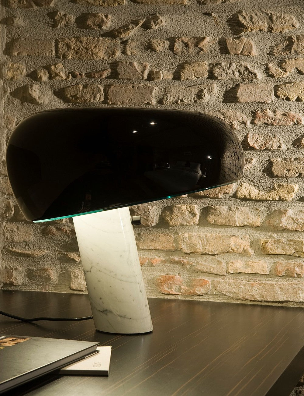 Snoopy unisce una base in marmo bianco a un paralume in metallo smaltato lucido e a uno spesso diffusore in vetro che fornisce una piacevole luce ambientale.