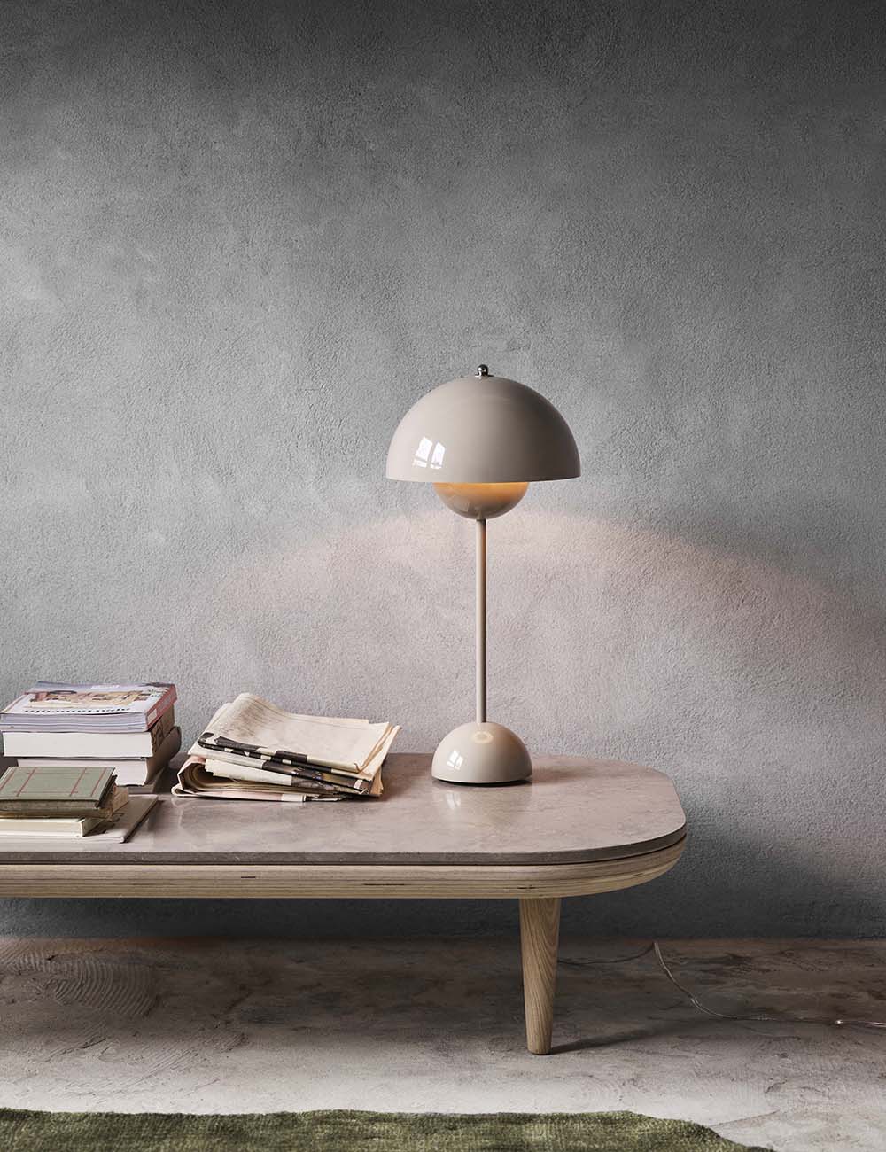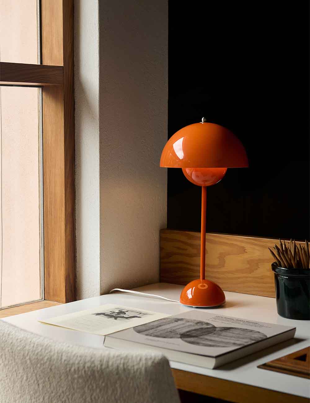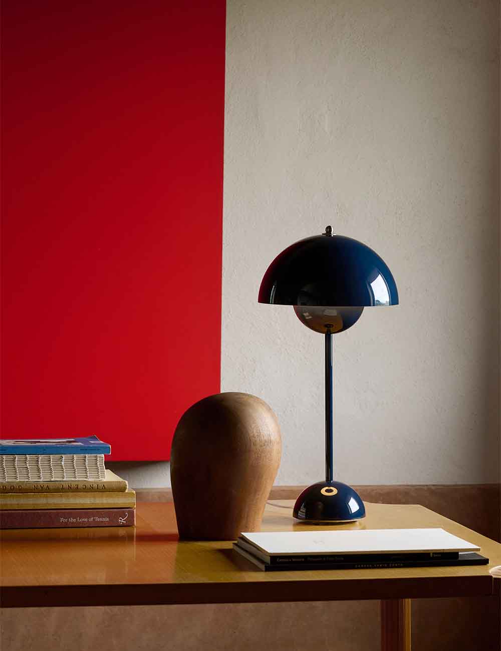 Flowerpot VP3 è la versione da tavolo del modello originale del 1969. I suoi due paralumi paralleli riflettono la luce l'uno sull'altro creando una luce morbida e avvolgente, ideale per creare un'atmosfera accogliente su scrivanie, comodini o angoli lettura. È disponibile in un'ampia varietà di colori per adattarsi a qualsiasi spazio.