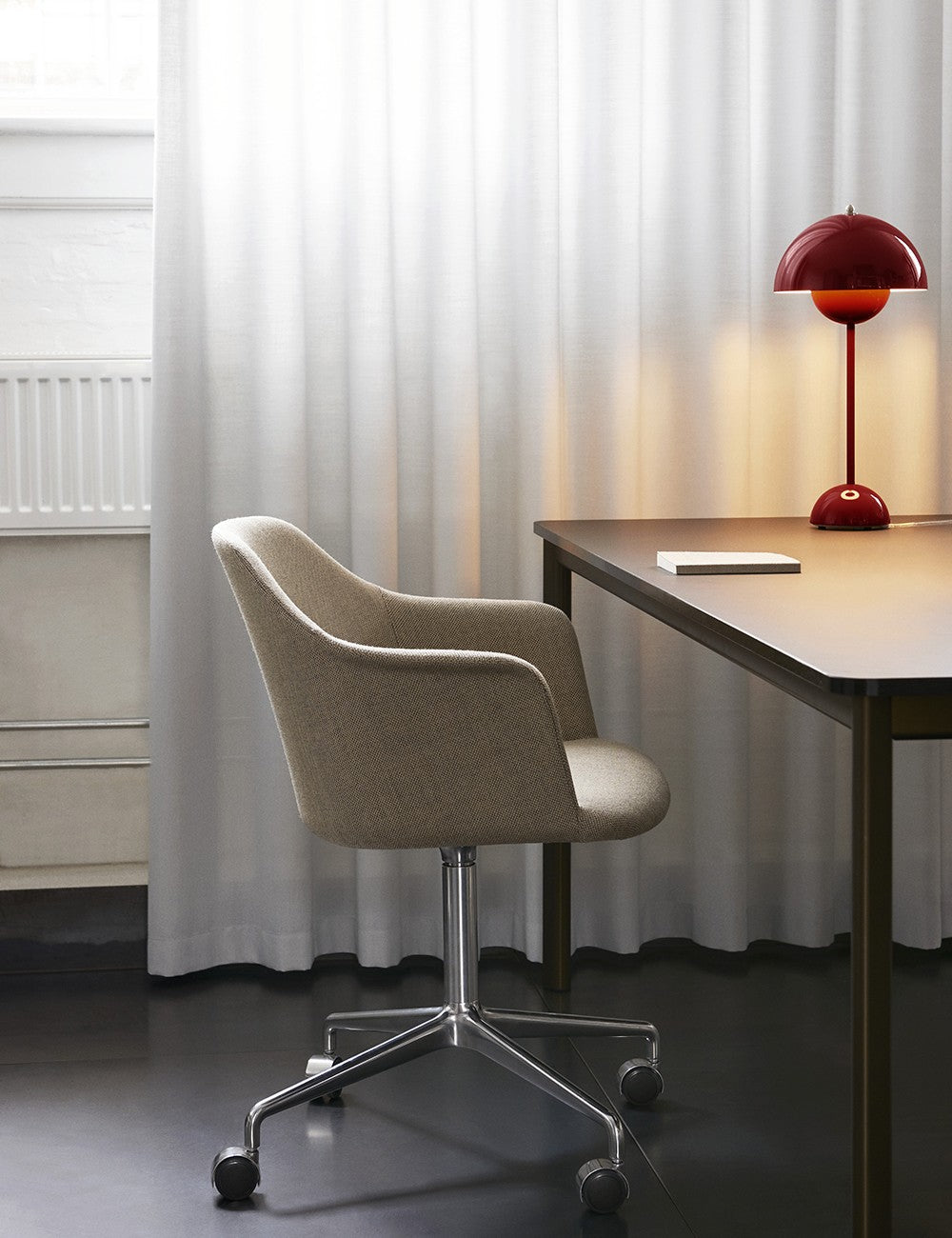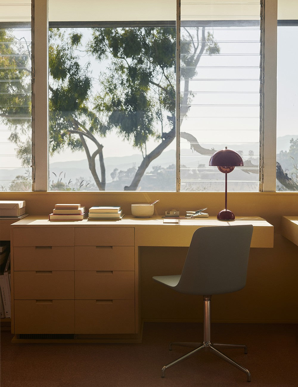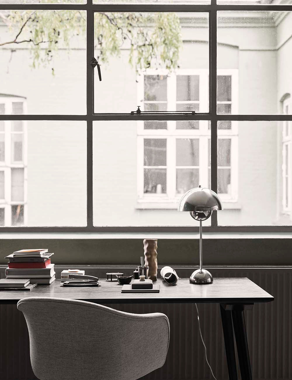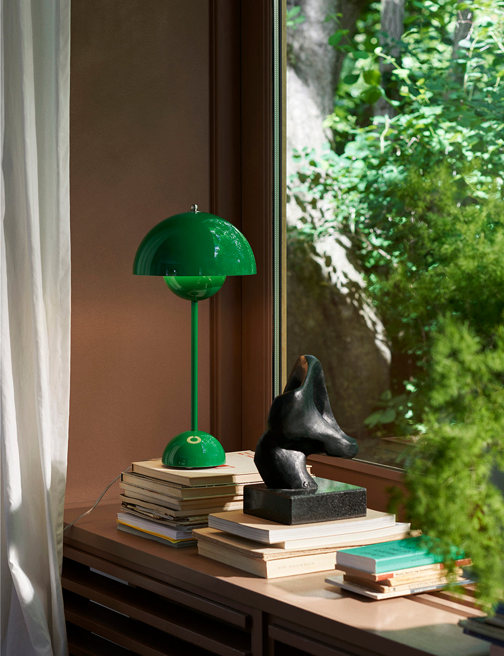 Flowerpot VP3 è la versione da tavolo del modello originale del 1969. I suoi due paralumi paralleli riflettono la luce l'uno sull'altro creando una luce morbida e avvolgente, ideale per creare un'atmosfera accogliente su scrivanie, comodini o angoli lettura. È disponibile in un'ampia varietà di colori per adattarsi a qualsiasi spazio.
