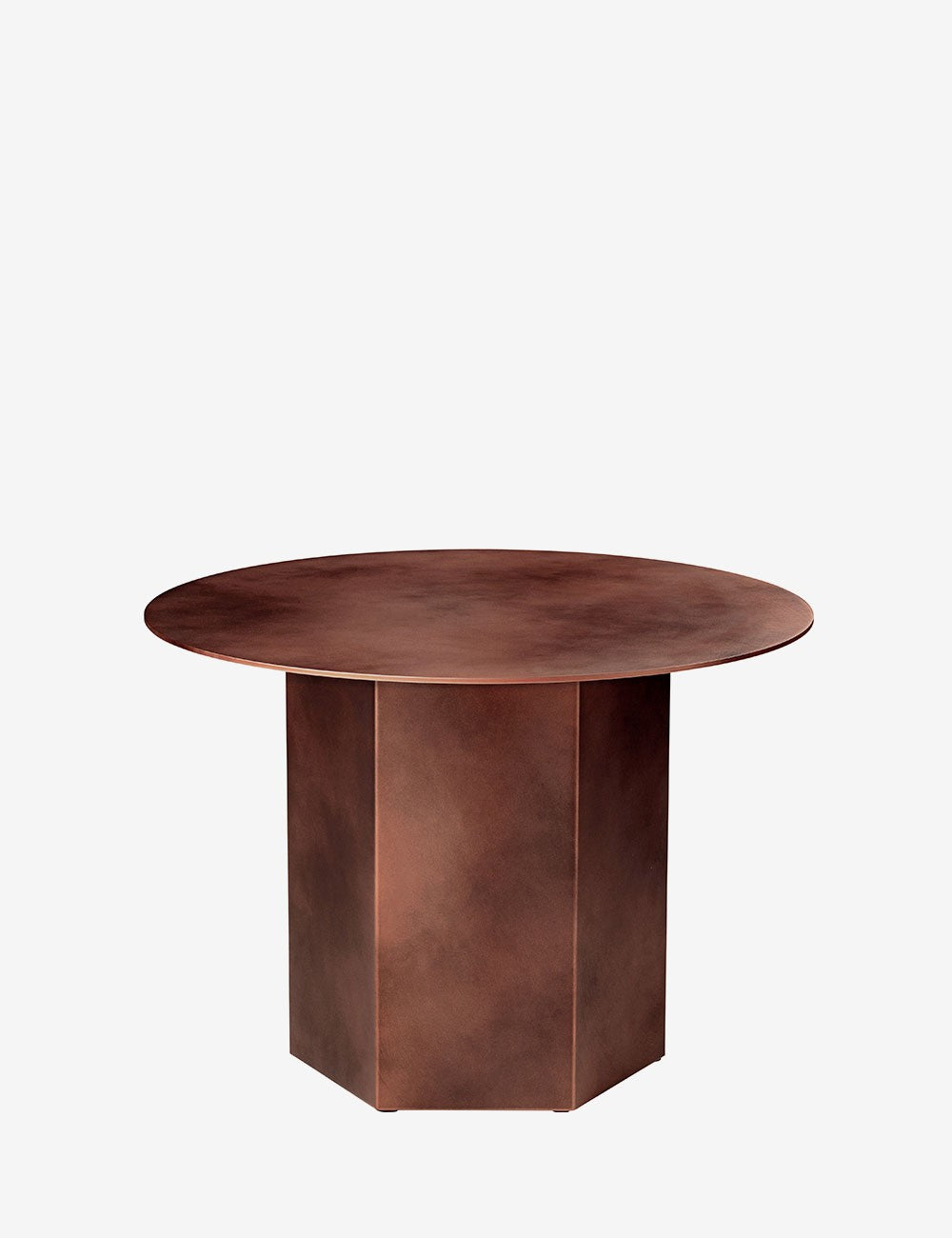 Originariamente realizzato in Italia in pietra travertino, la nuova variante del tavolo segna la prima volta che GamFratesi lavora con lastre di acciaio, che vengono zincate, laccate e poi sottoposte a una serie di processi di finitura manuale per creare una superficie unica per ogni tavolo.
