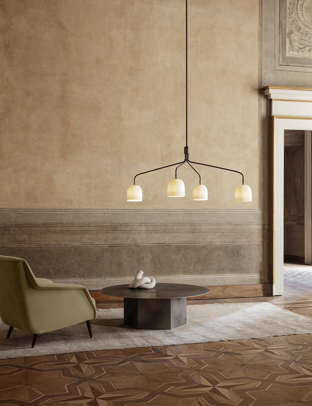 Il lampadario Howard è disponibile con 4 o 6 bracci e due finiture del paralume: Gunmetal, in ottone con rivestimento in bronzo, o Bone China, in porcellana opaca. Entrambe le opzioni offrono una luce calda e accogliente.