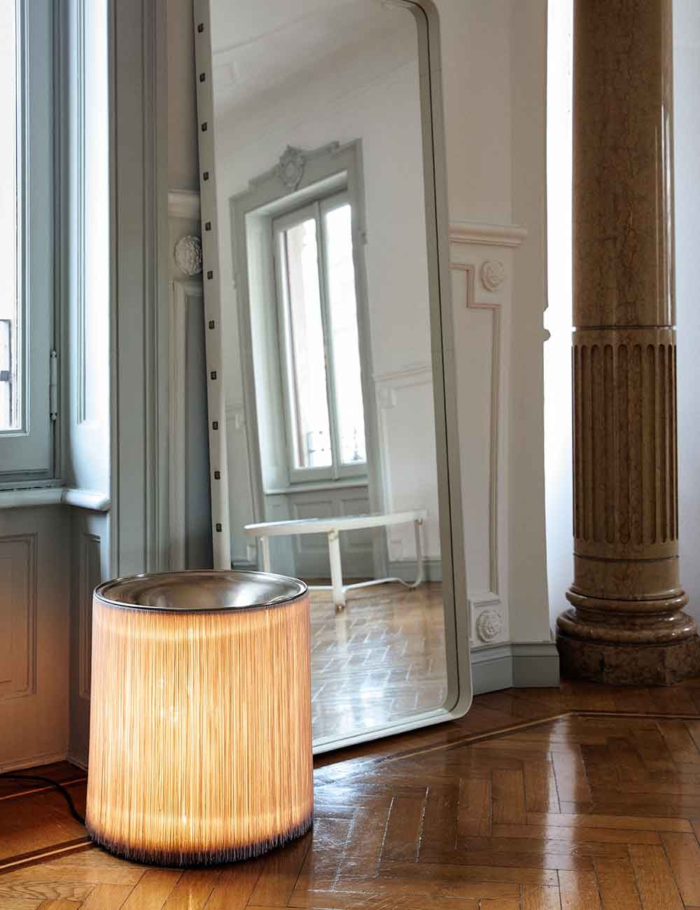 Grazie alla varietà di lampadine laterali e con frange, il modello 597 emette un gioco di luce indiretta ambientale a 360°, mentre la copertura in alluminio riflettente aggiunge calore alla luce dall'alto.