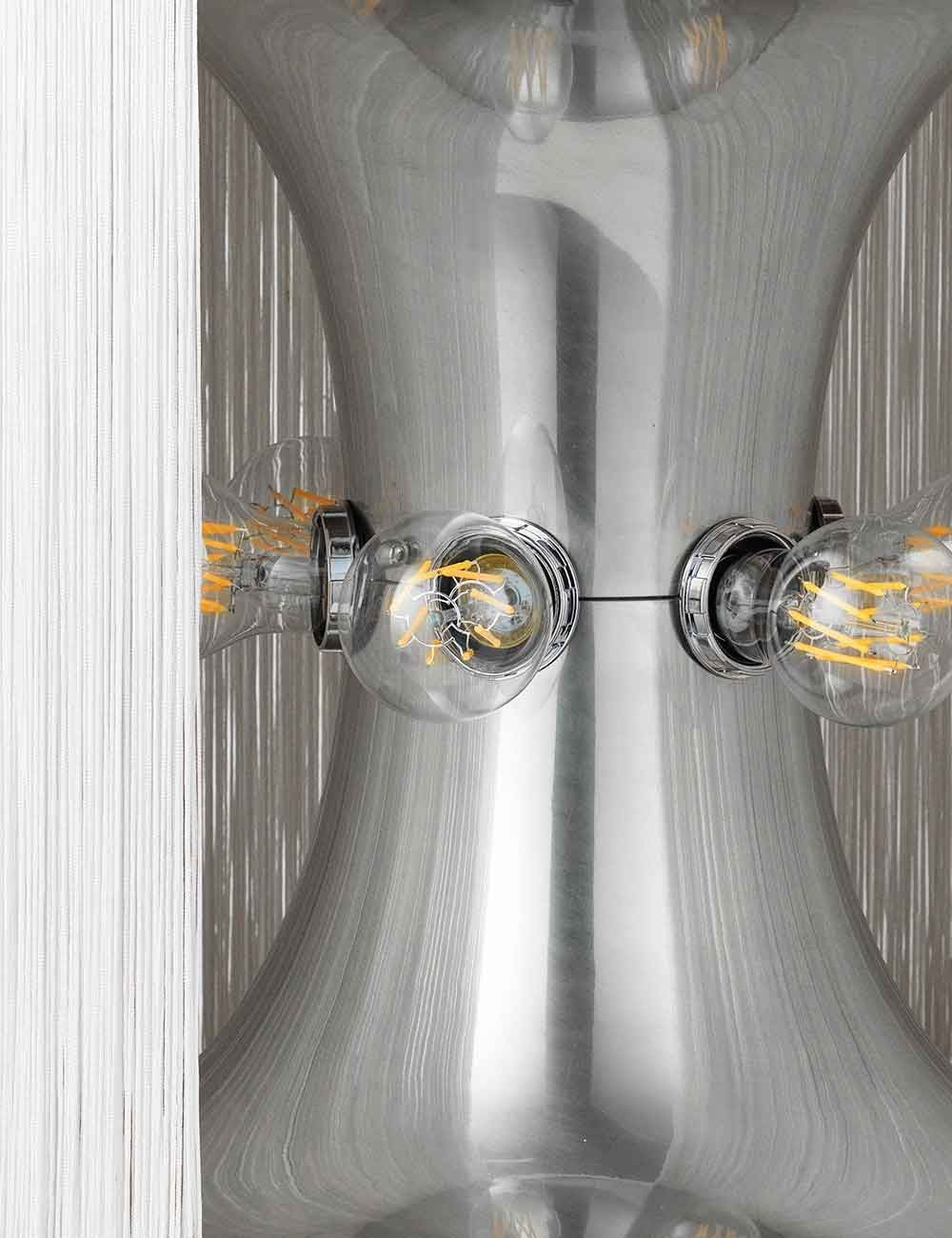 La forma unica e giocosa del modello 597 incarna perfettamente lo straordinario approccio di Frattini all'estetica della luce. Le frange in nylon traggono ispirazione sia dal mondo della moda sia dalle tende a frange che si trovavano comunemente nei bar e nei supermercati italiani alla fine degli anni '50.