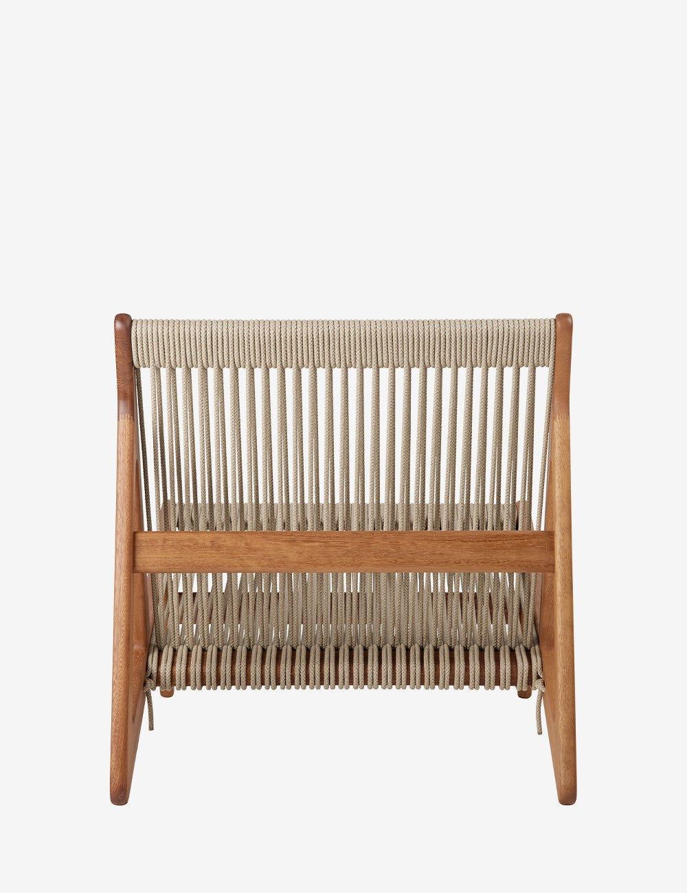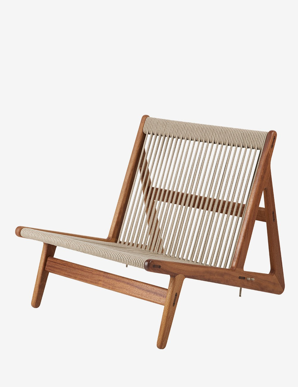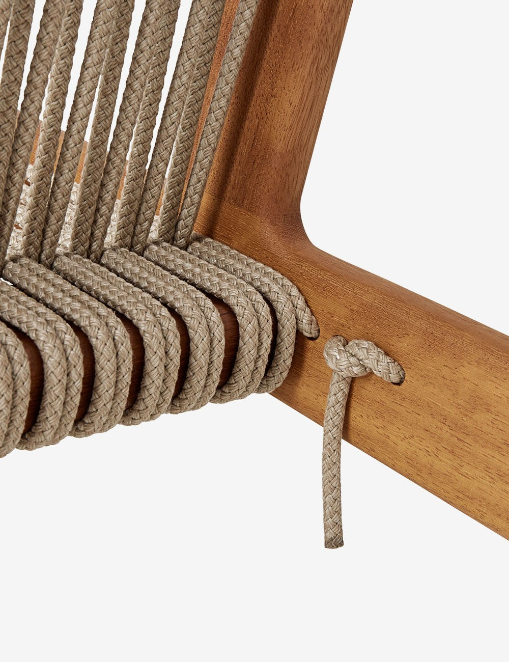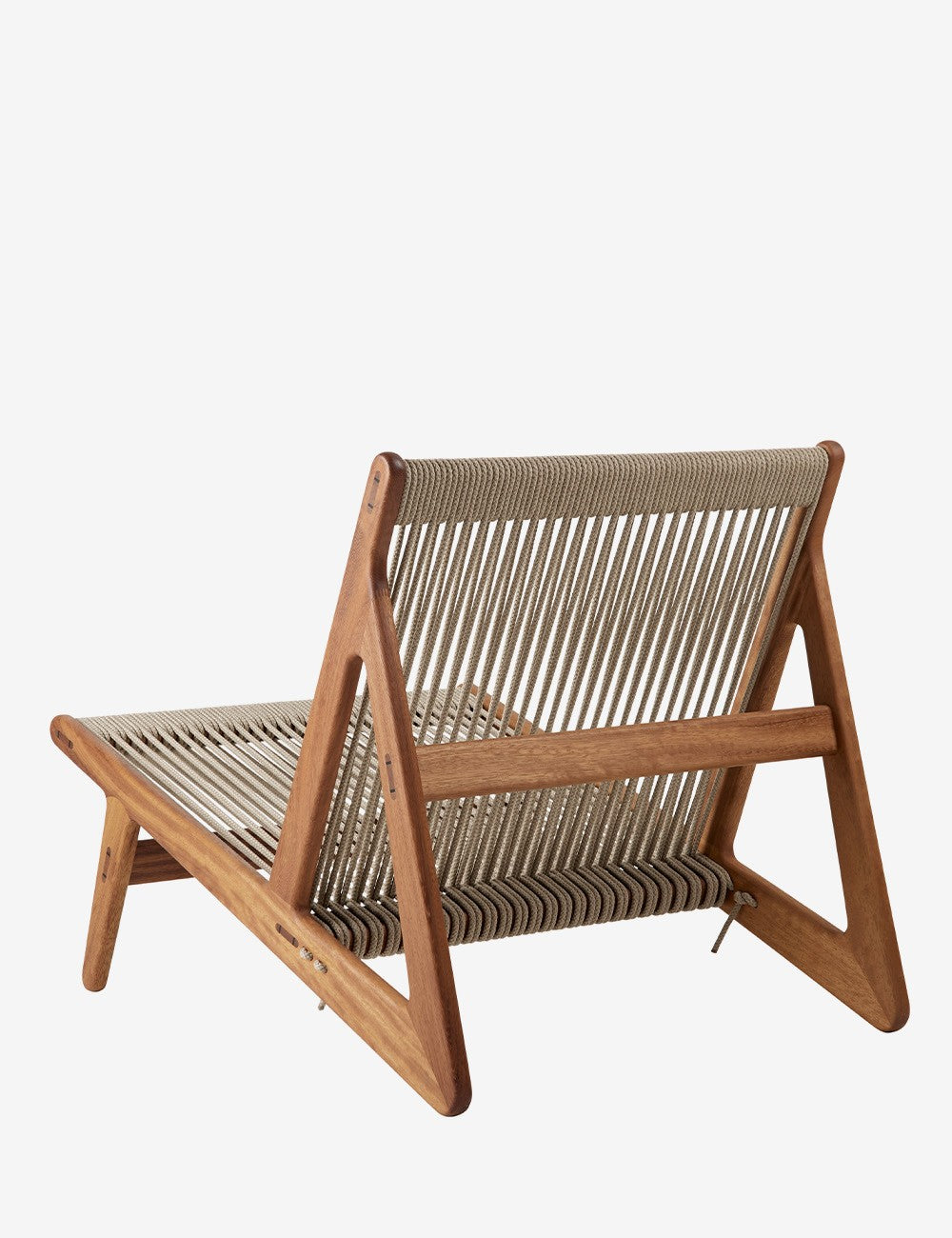 La combinazione di legno e corda della MR01 crea una seduta semplice che sembra fluttuare. Il telaio in iroko certificato FSC è realizzato senza viti o chiodi ed è particolarmente resistente, rendendo questo legno perfetto per l'uso esterno. I 90 metri di corda di lino naturale che compongono la seduta sono intrecciati a mano.