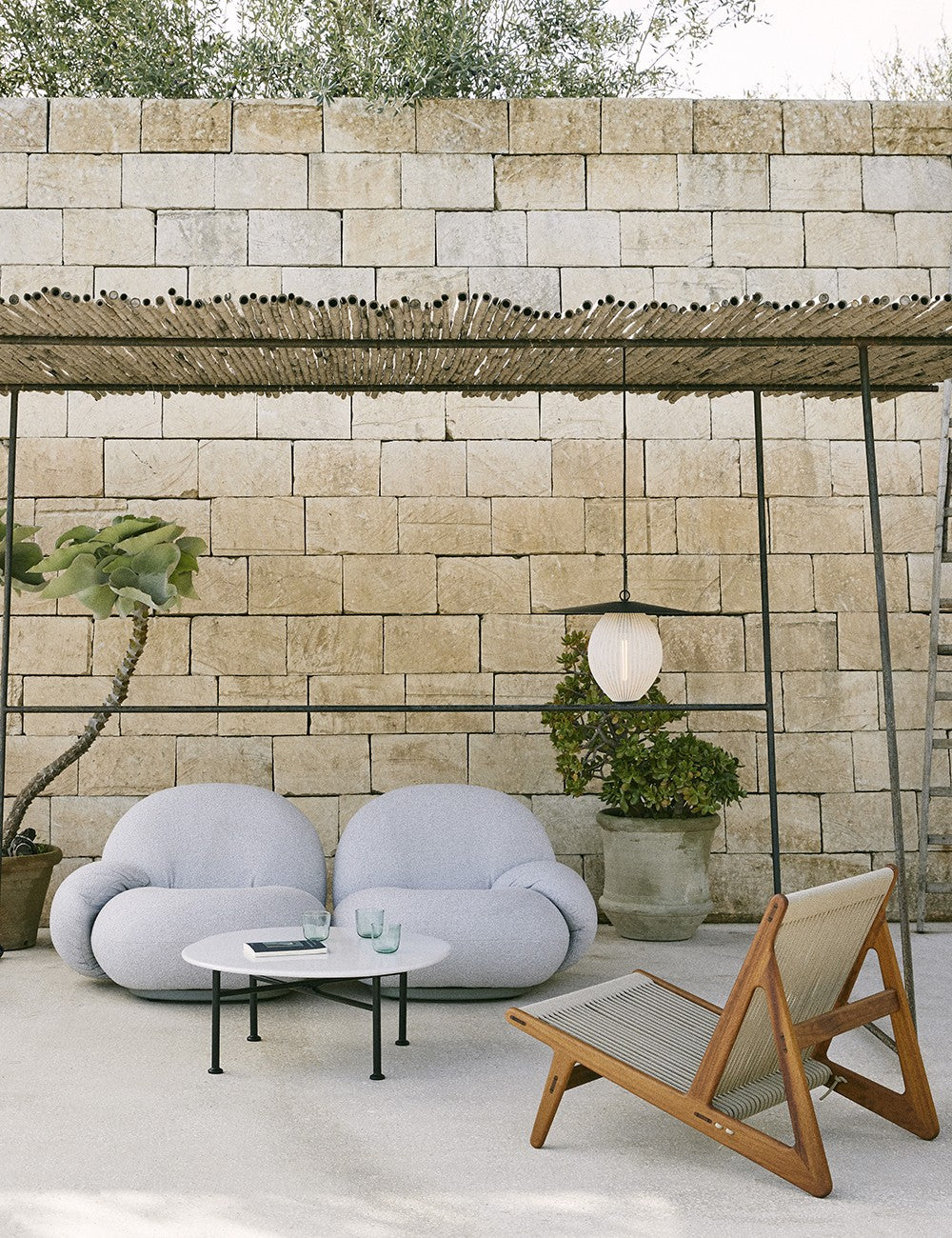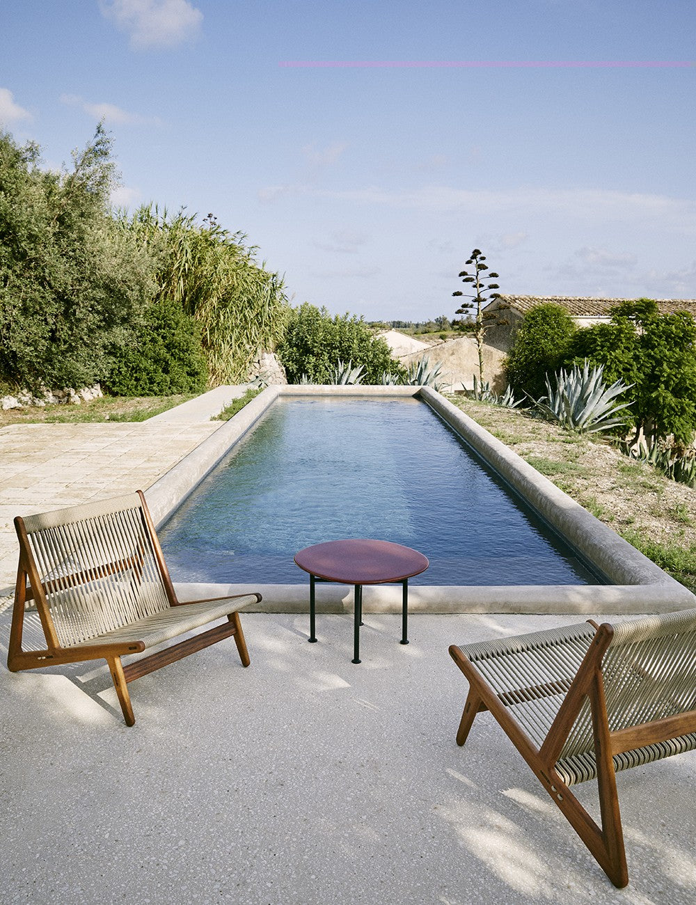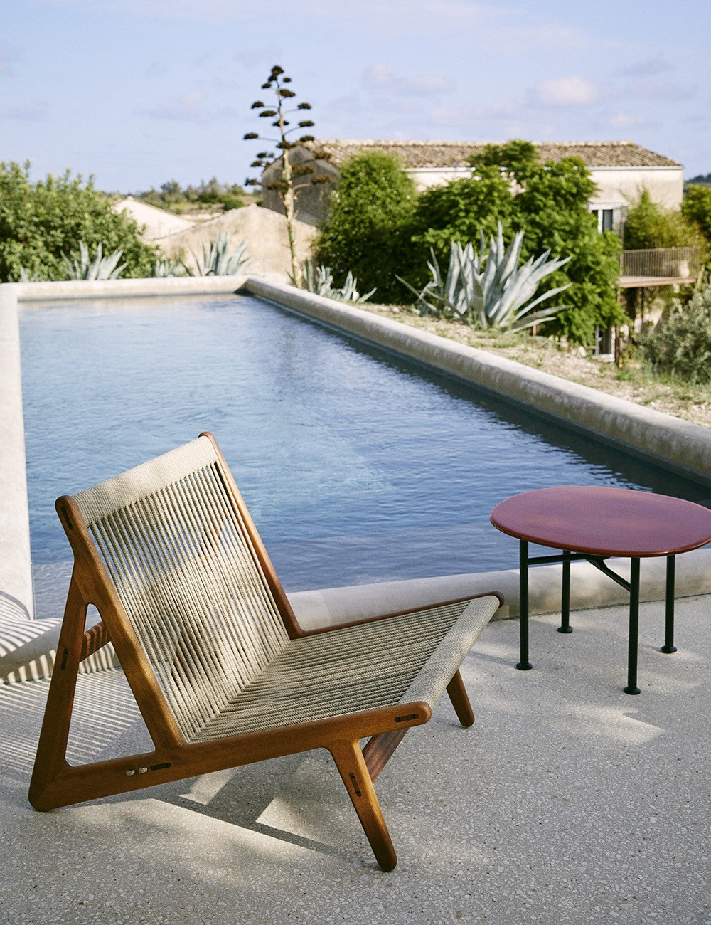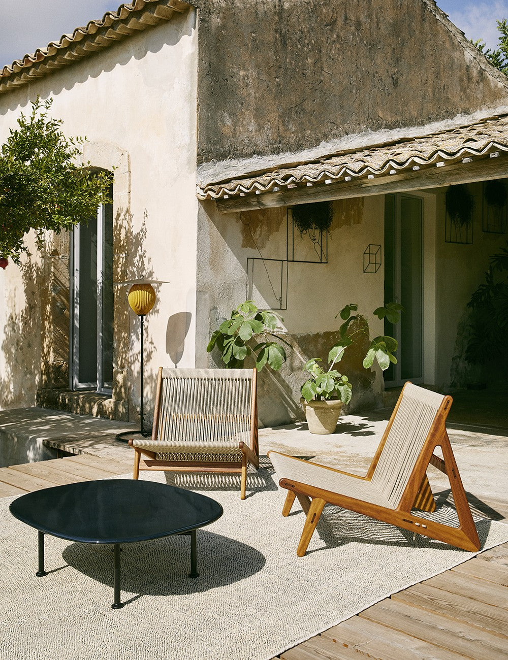 La combinazione di legno e corda della MR01 crea una seduta semplice che sembra fluttuare. Il telaio in iroko certificato FSC è realizzato senza viti o chiodi ed è particolarmente resistente, rendendo questo legno perfetto per l'uso esterno. I 90 metri di corda di lino naturale che compongono la seduta sono intrecciati a mano.