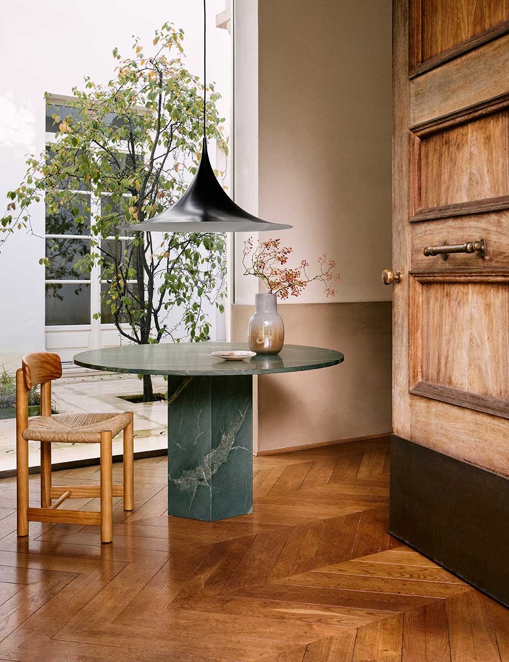 La Semi Pendant è una lampada unica basata su due quarti di cerchio uniti schiena contro schiena. Il suo caratteristico paralume arcuato in metallo smaltato crea una luce diffusa e conica, ideale per un tavolo da pranzo o un bancone della cucina.
