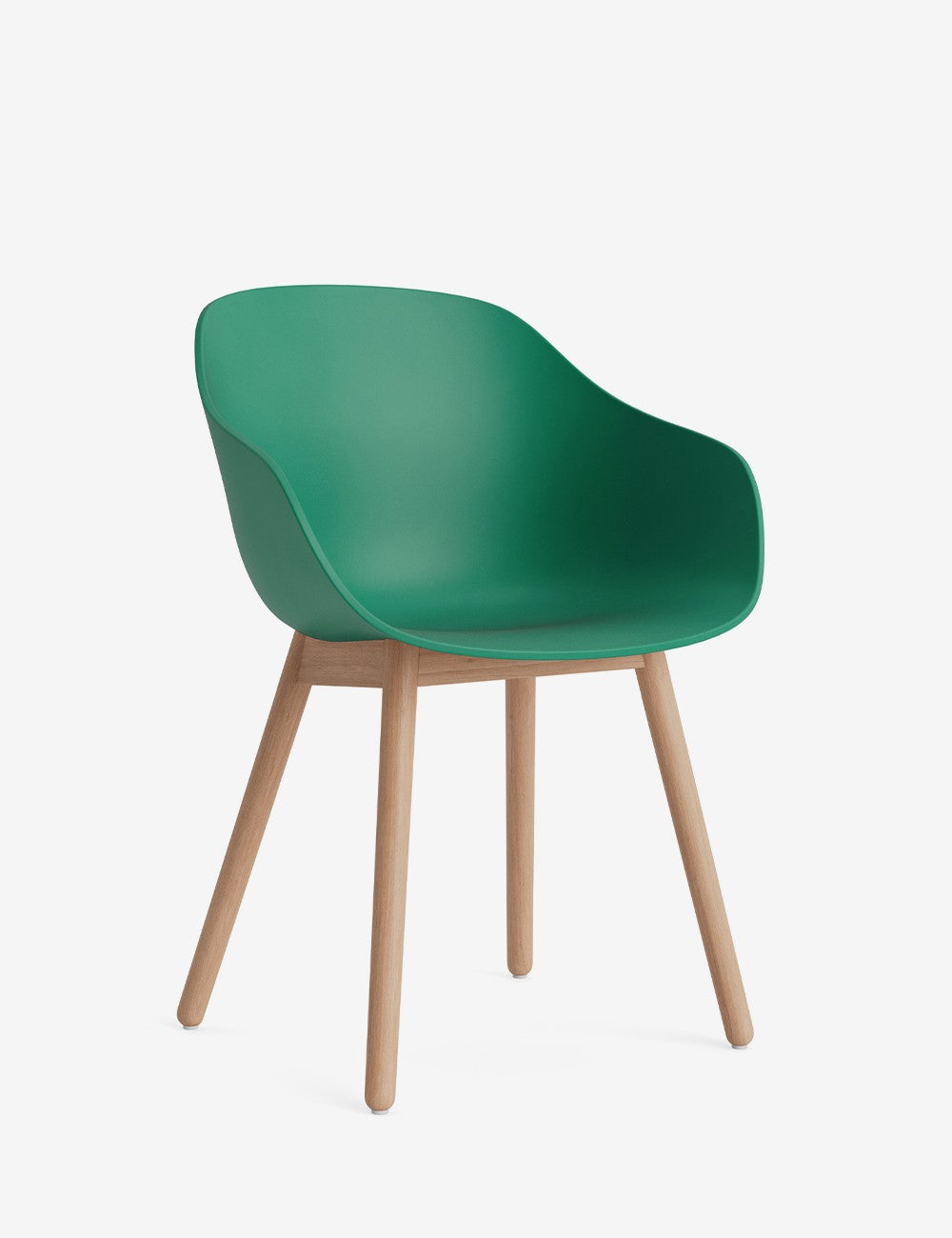 La seduta aerodinamica della sedia è realizzata in polipropilene riciclato post-consumo, mentre la struttura in legno è realizzata in rovere o noce e rifinita con una lacca a base d'acqua ecologica.