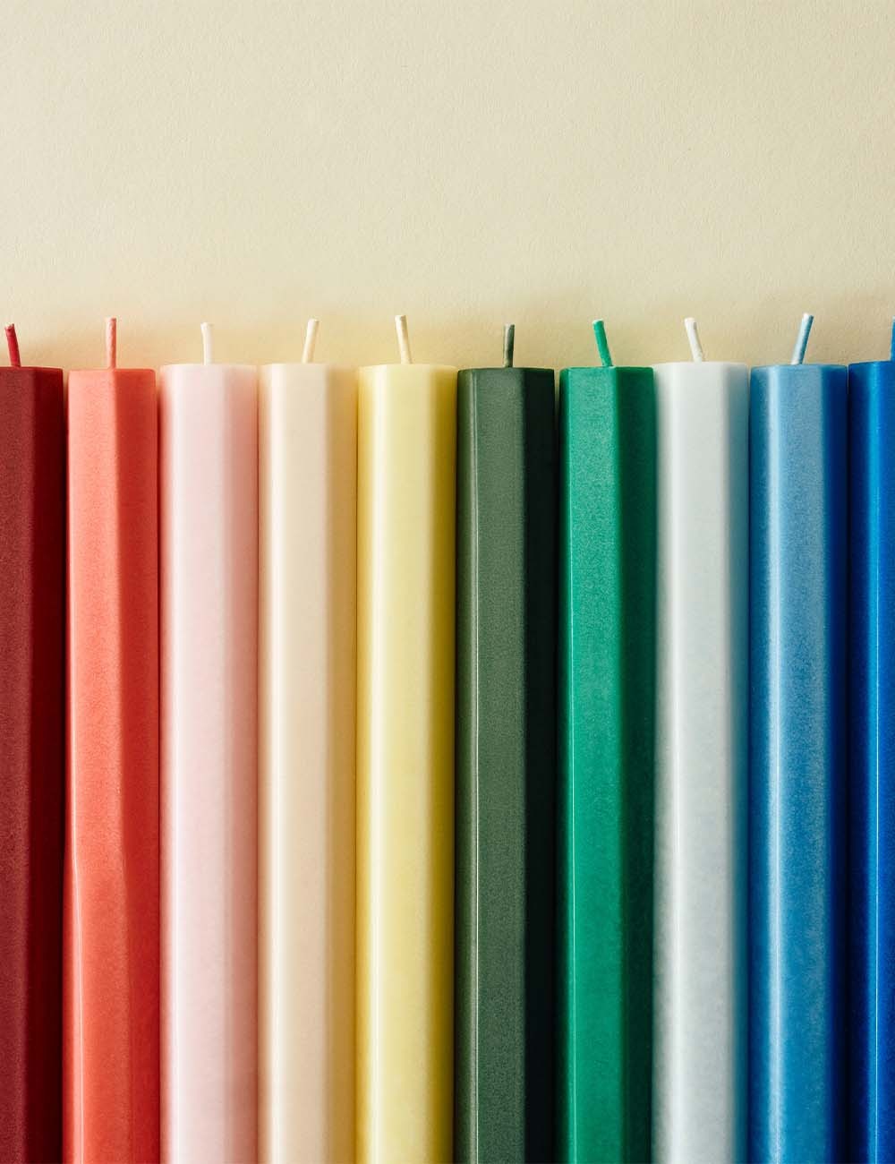 Con la loro forma esagonale e la finitura opaca, queste candele colorate sono perfette sia in gruppo che singolarmente. Certificate con il marchio ecologico Nordic Swan, offrono una durata di combustione pulita di circa 7 ore. Le candele quadrate sono vendute singolarmente o in set da quattro, con una varietà di combinazioni di colori tra cui scegliere, perfette per tavoli, mensole o come elemento decorativo in qualsiasi stanza.
