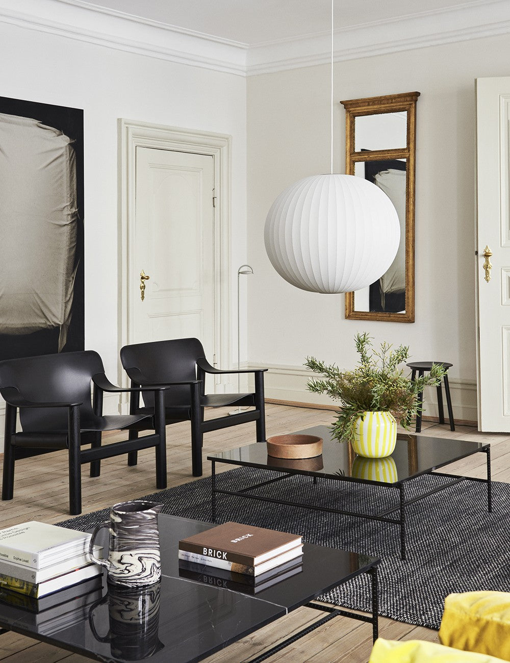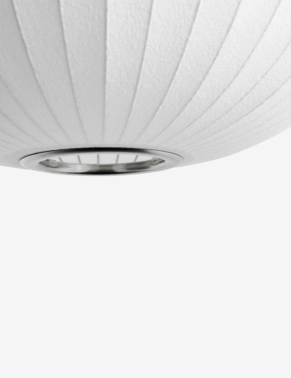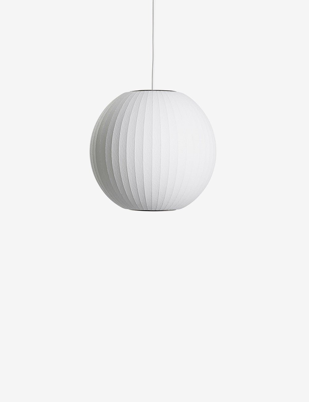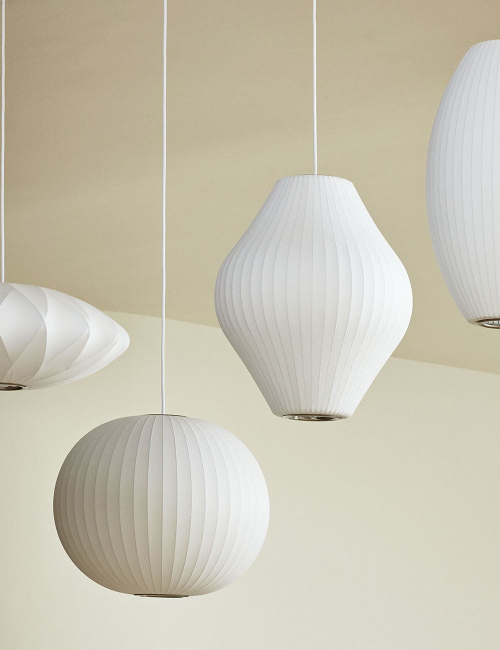 George Nelson è riuscito a creare apparecchi di illuminazione senza tempo e dall'aspetto sofisticato, utilizzando forme elementari e sferiche come una mela, una pera o un sigaro e materiali moderni come l'acciaio spazzolato e il noce.