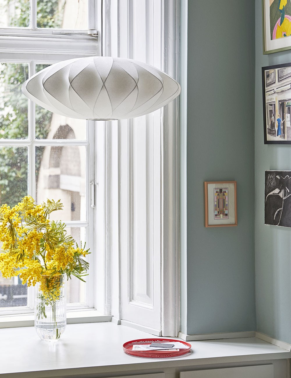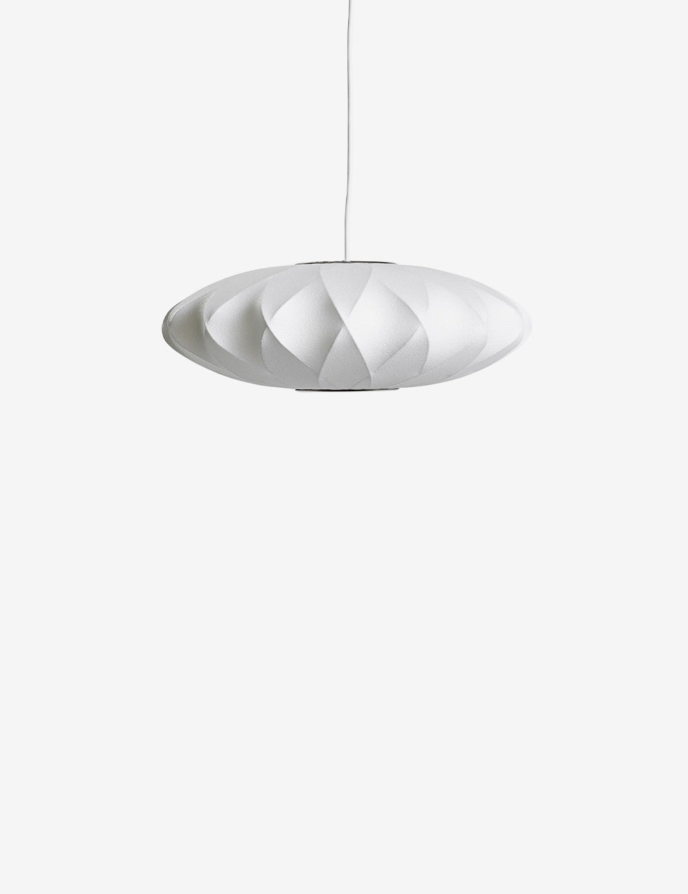 George Nelson è riuscito a creare apparecchi di illuminazione senza tempo e dall'aspetto sofisticato, utilizzando forme elementari e sferiche come una mela, una pera o un sigaro e materiali moderni come l'acciaio spazzolato e il noce.