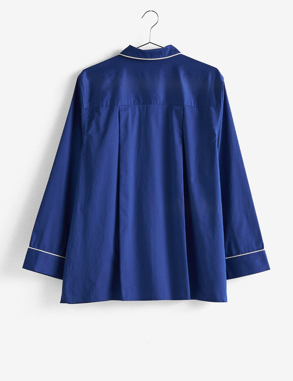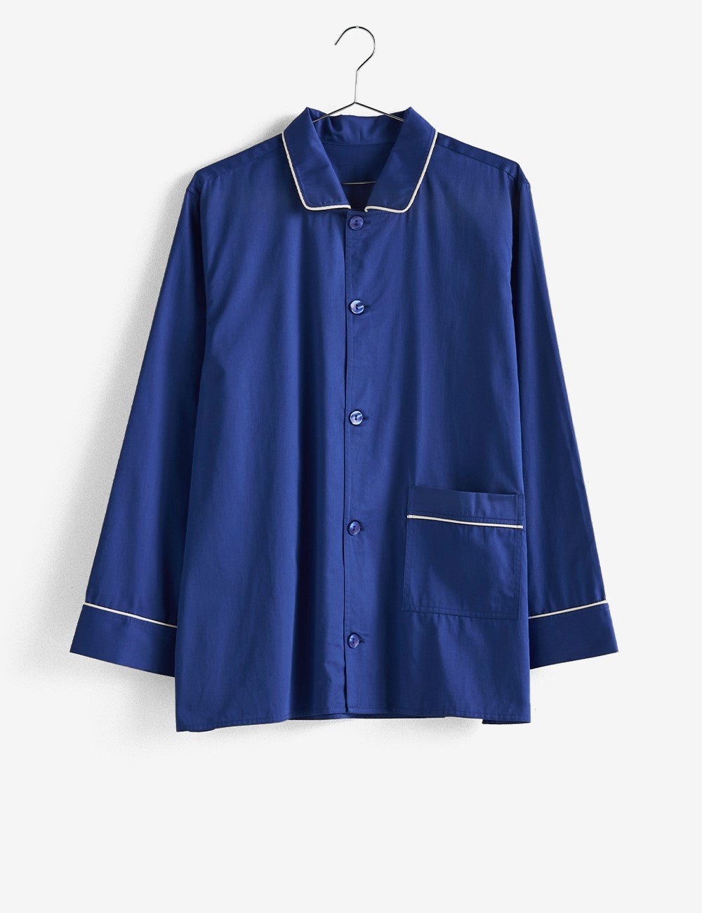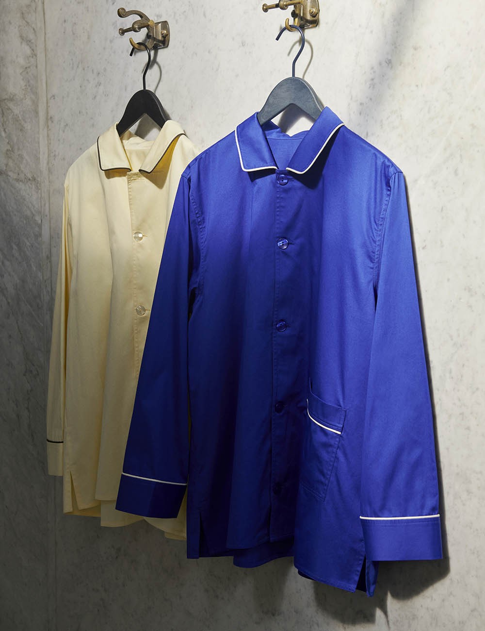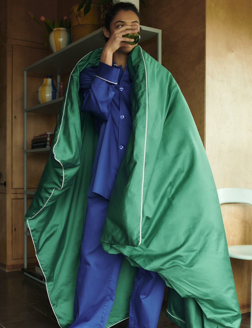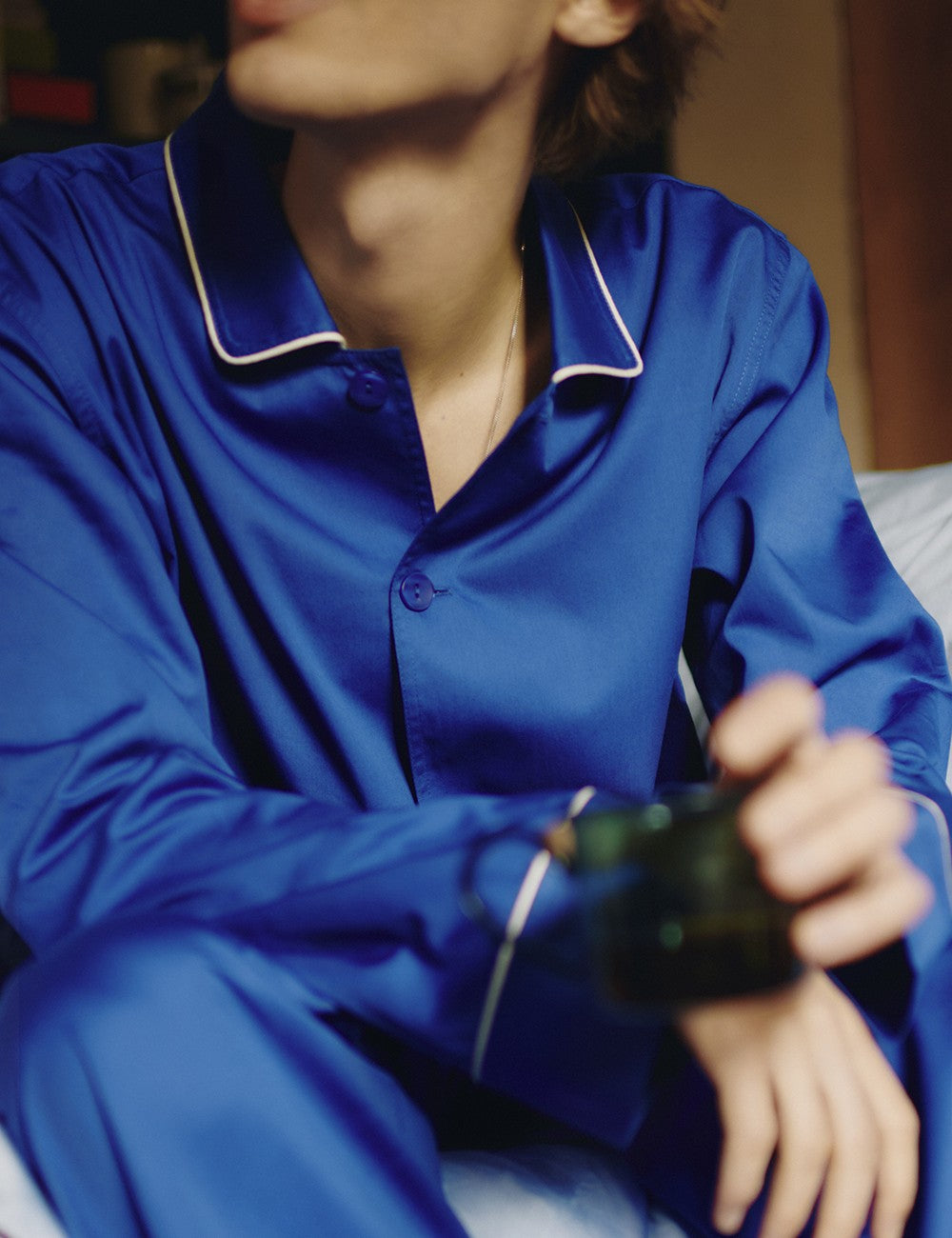 Il pigiama Outline di HAY unisce colori vivaci e leggermente satinati a rifiniture ricamate a contrasto, creando un look elegante e confortevole.