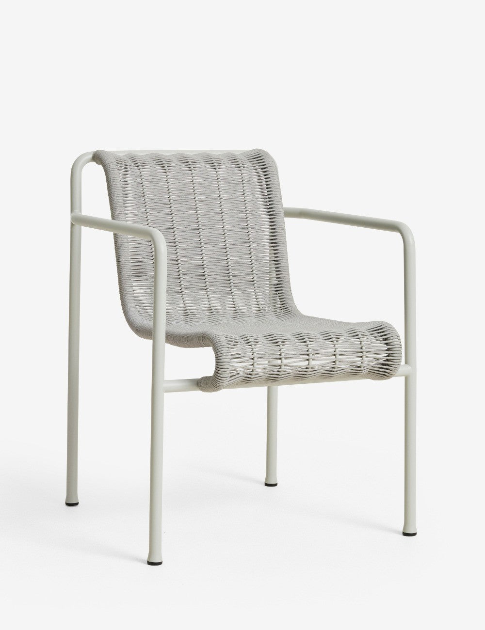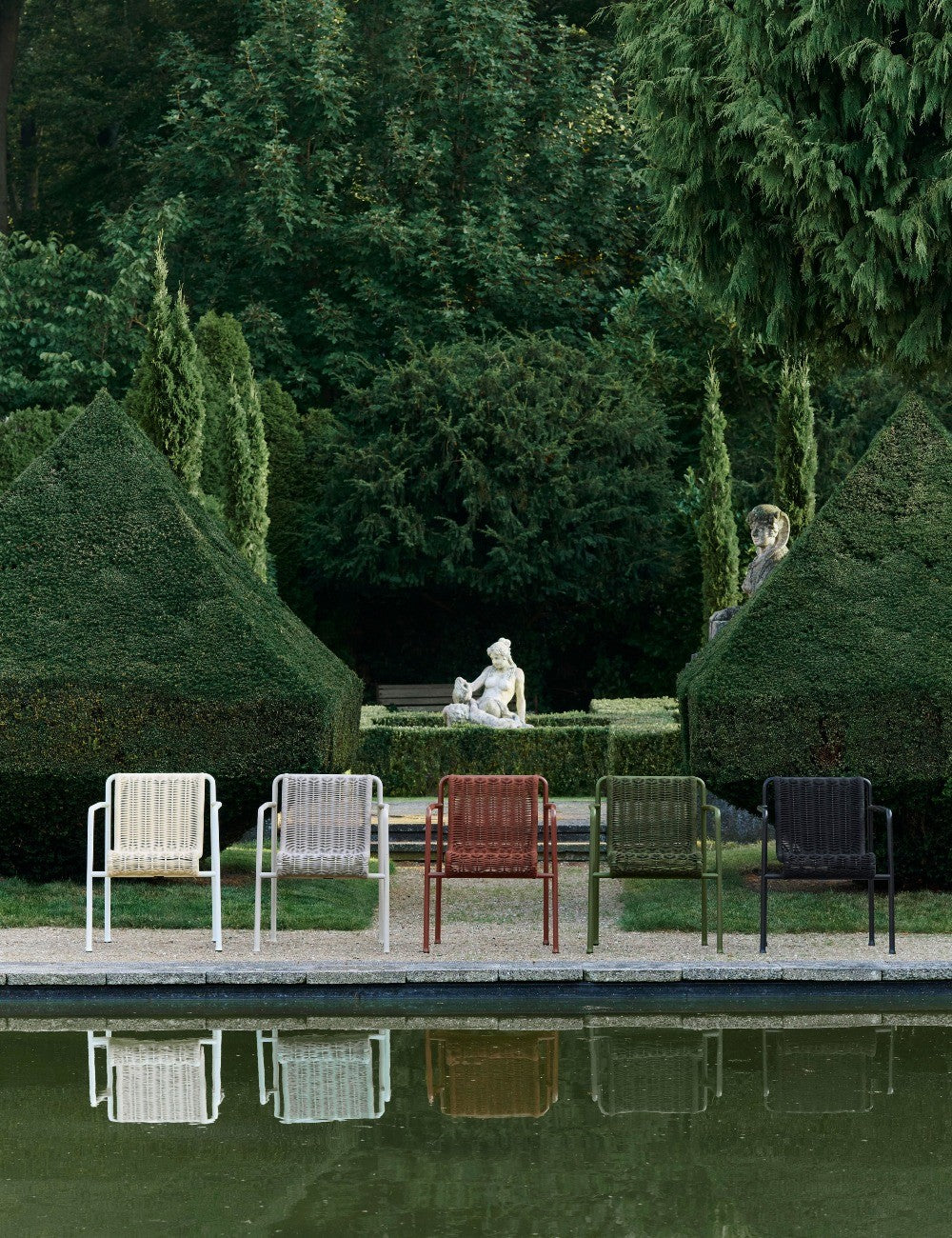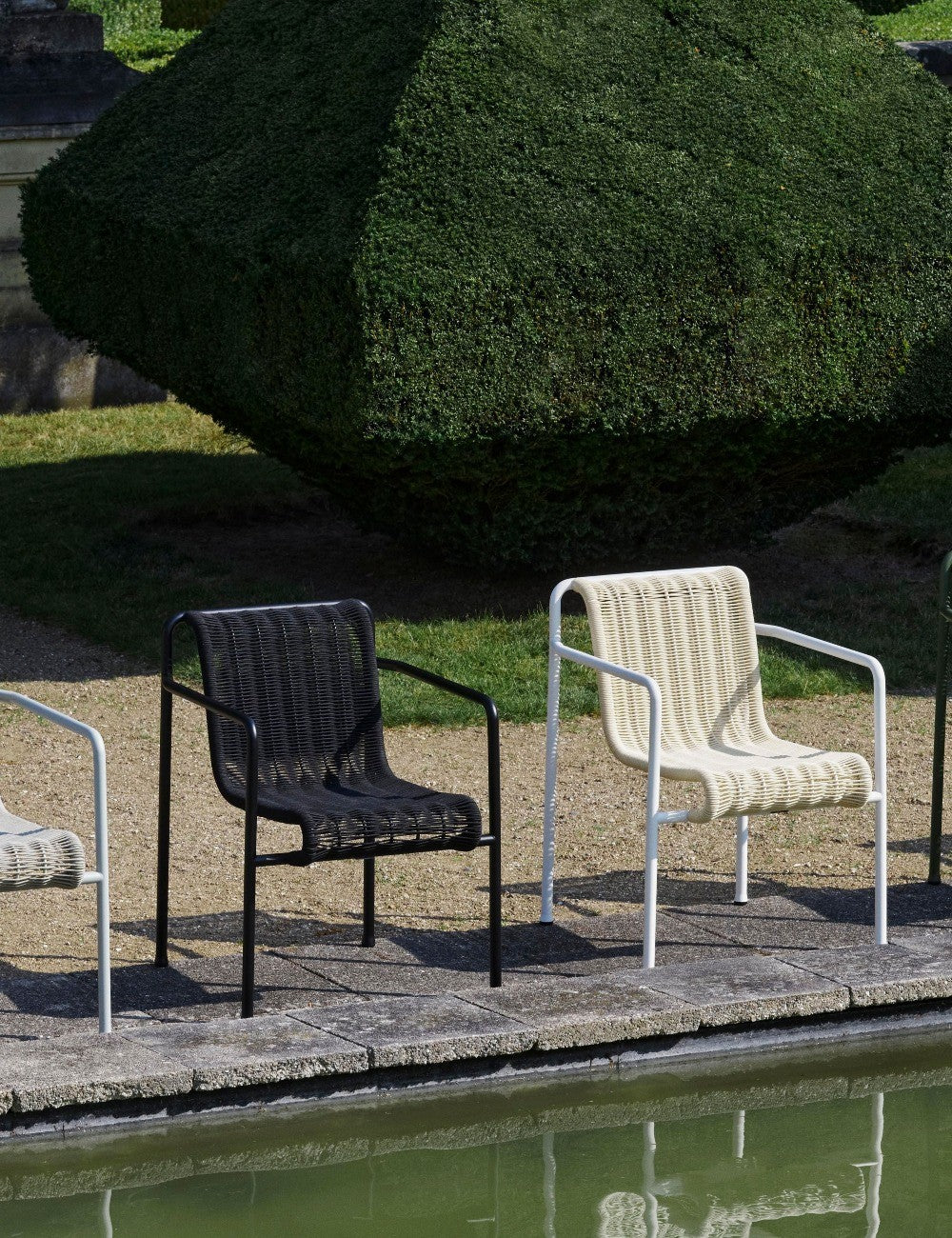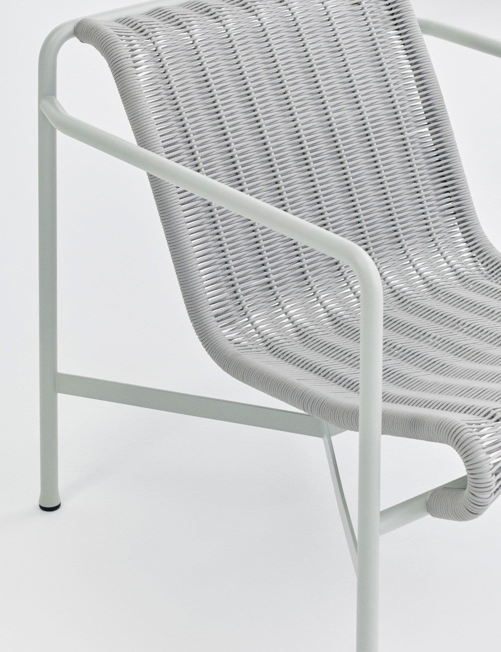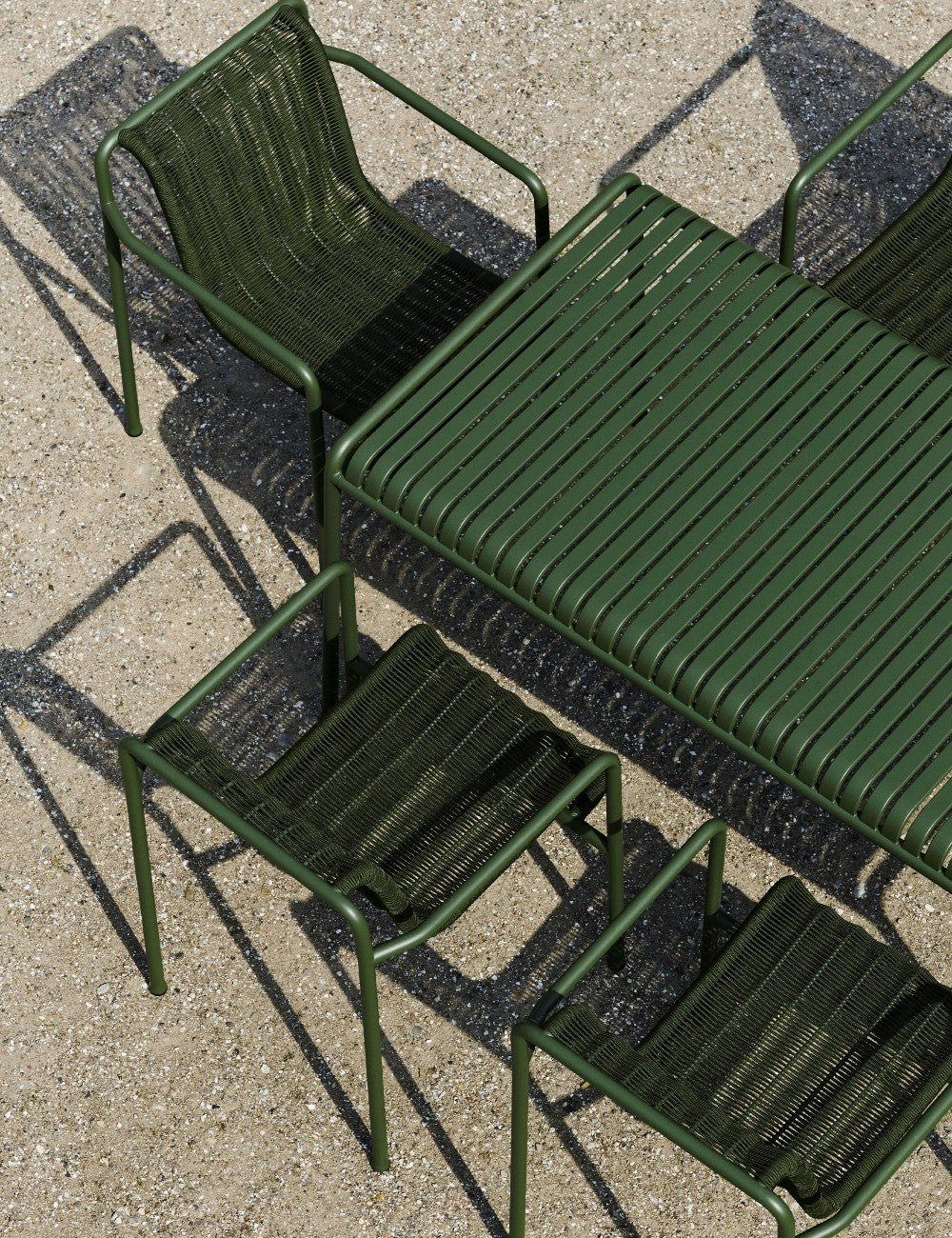 Palissade Cord condivide lo stesso linguaggio di design della collezione originale, combinando un'espressione più morbida con la semplicità visiva e la resistenza di Palissade. Il cordino in poliestere riciclato è intrecciato a mano sulla struttura in acciaio in un colore tono su tono, creando una seduta comoda e resistente.
