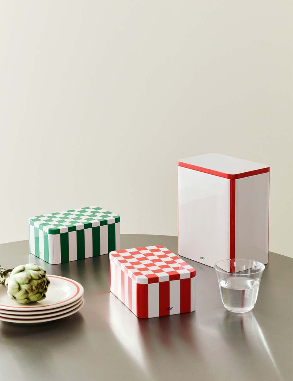I contenitori in latta HAY combinano funzionalità e decorazione con motivi grafici colorati. Il coperchio e il corpo si incastrano armoniosamente per un design pulito, ideale per conservare alimenti secchi e organizzare gli oggetti in casa.