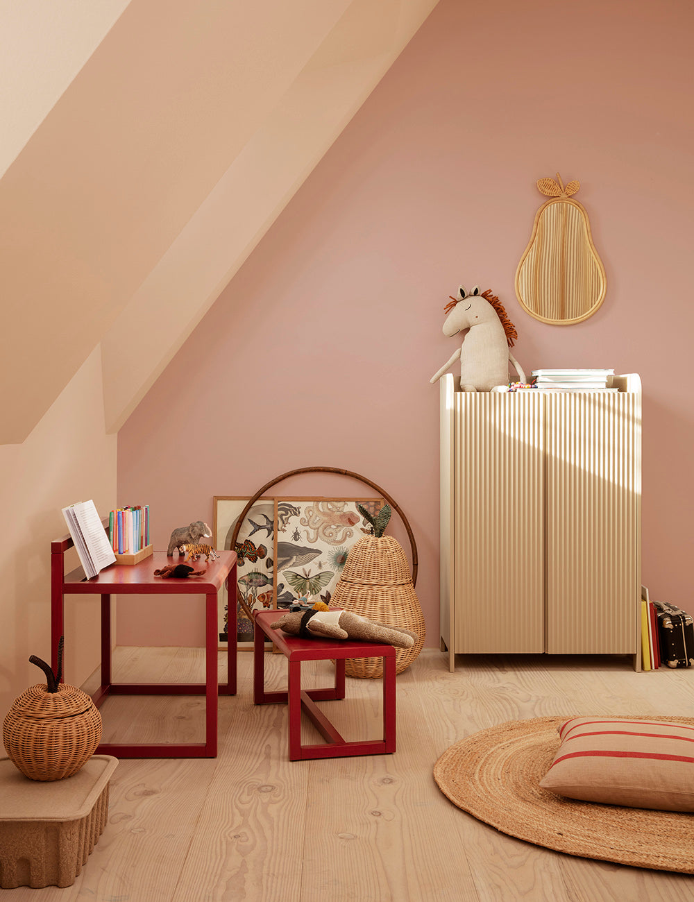 La serie comprende sedia, panca, tavolo e scrivania, adattandosi alle diverse esigenze e fasi dell'infanzia e offrendo un tocco di stile senza tempo che si adatta a qualsiasi arredamento.