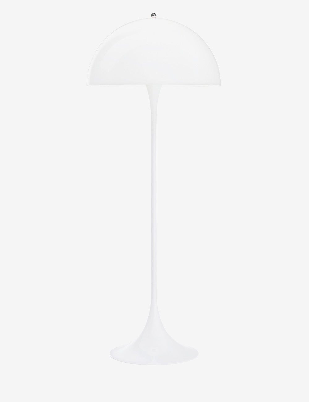 Il piede Panthella incorpora un nuovo schermo diffusore che previene la formazione di ombre visibili sul paralume opalino. Il supporto è stato regolato in modo che la struttura svasata e i punti di convergenza metallici rimangano dritti e bianchi nel tempo.