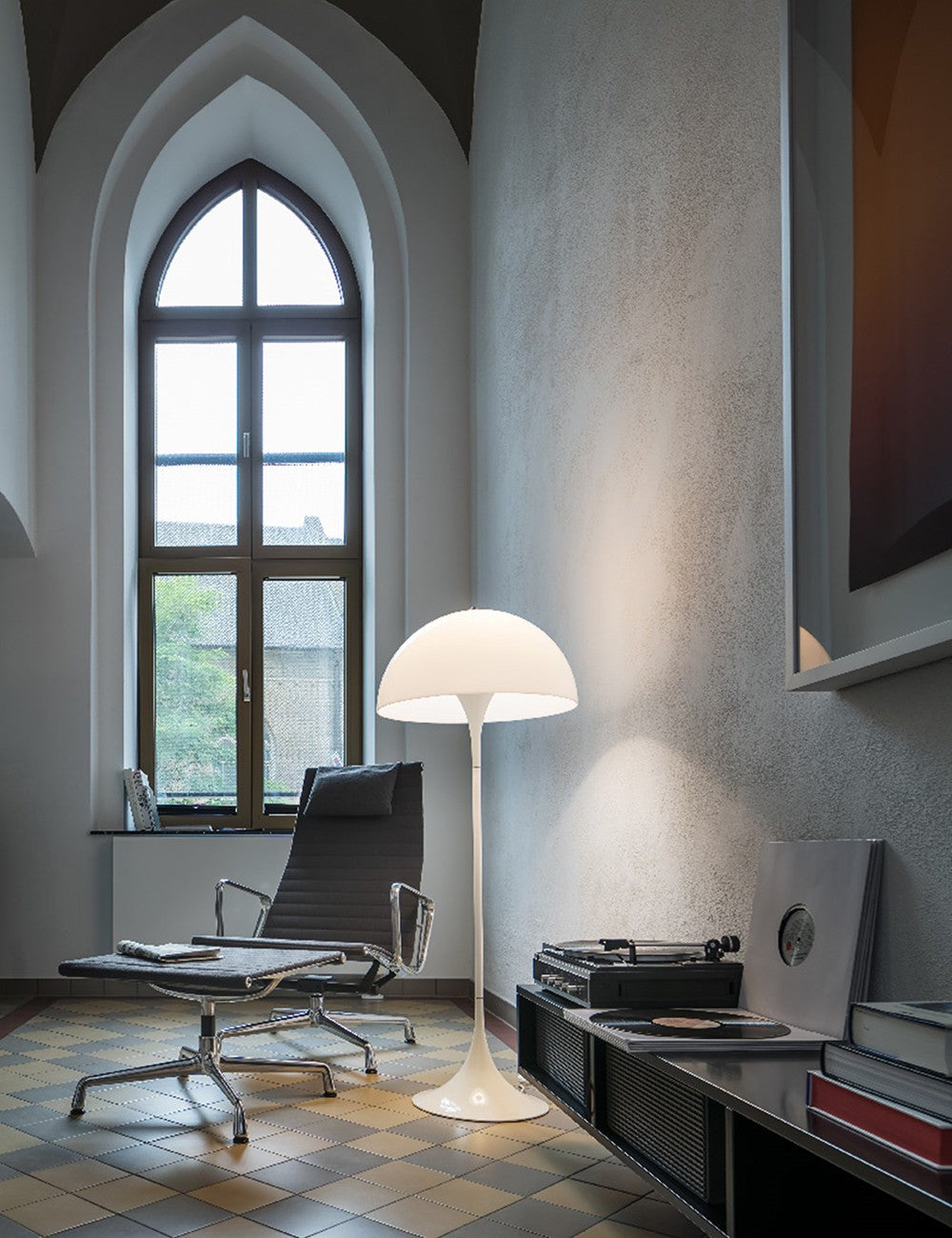 Panton ha combinato questa idea con le forme organiche caratteristiche delle sue creazioni, ottenendo una luce ambientale priva di abbagliamento.