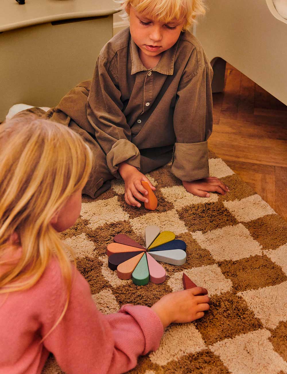 Realizzato artigianalmente con la tecnica del tufting a mano e cotone biologico certificato GOTS, questo tappeto unisce un design audace ed equilibrato che conferisce un tocco giocoso e contrastante a qualsiasi stanza.