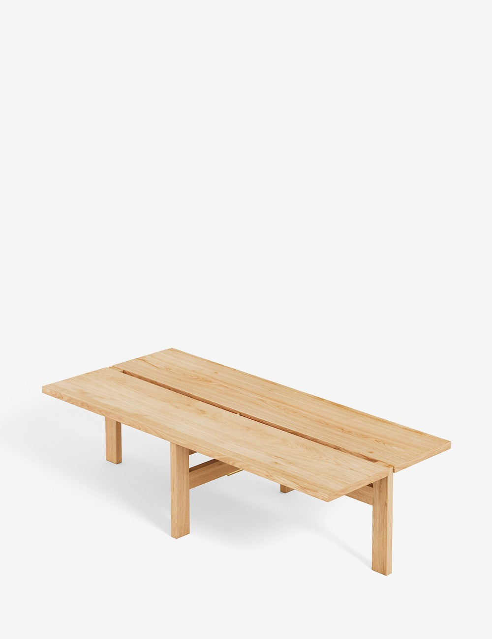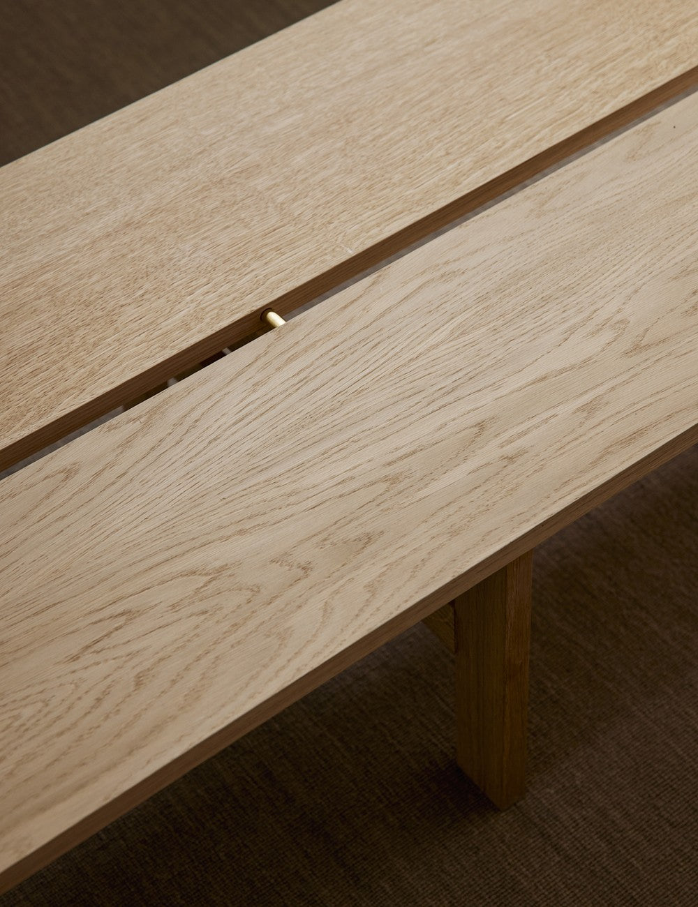 Il design è costituito da un piano in legno impiallacciato in rovere e da una coppia di gambe a croce in massello di rovere con ancoraggi in ottone.