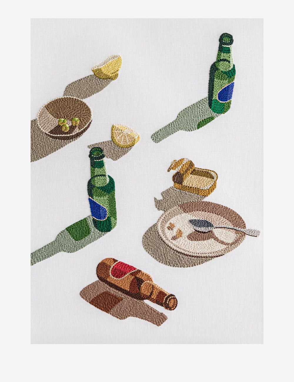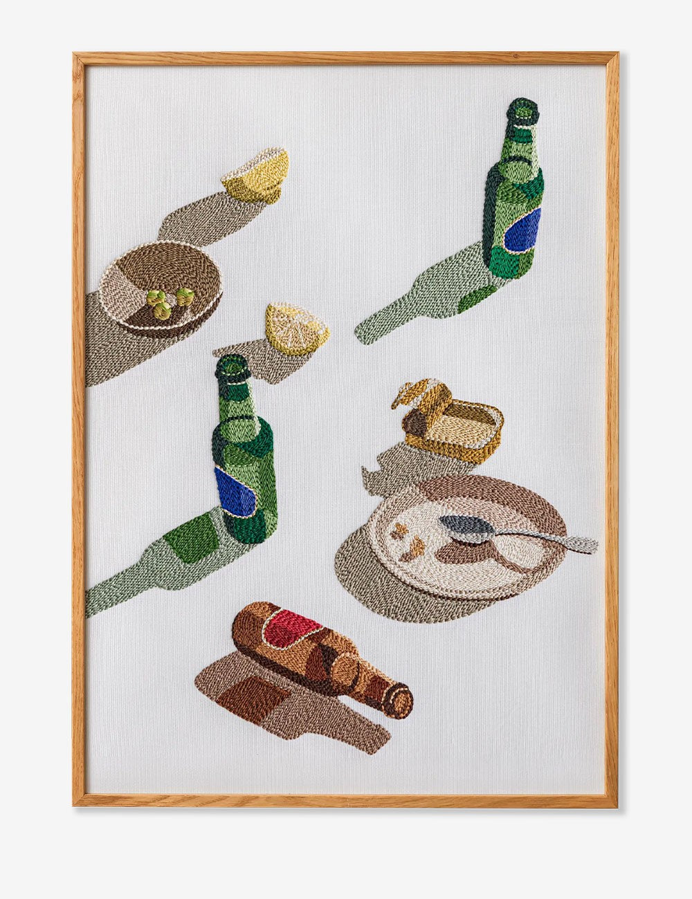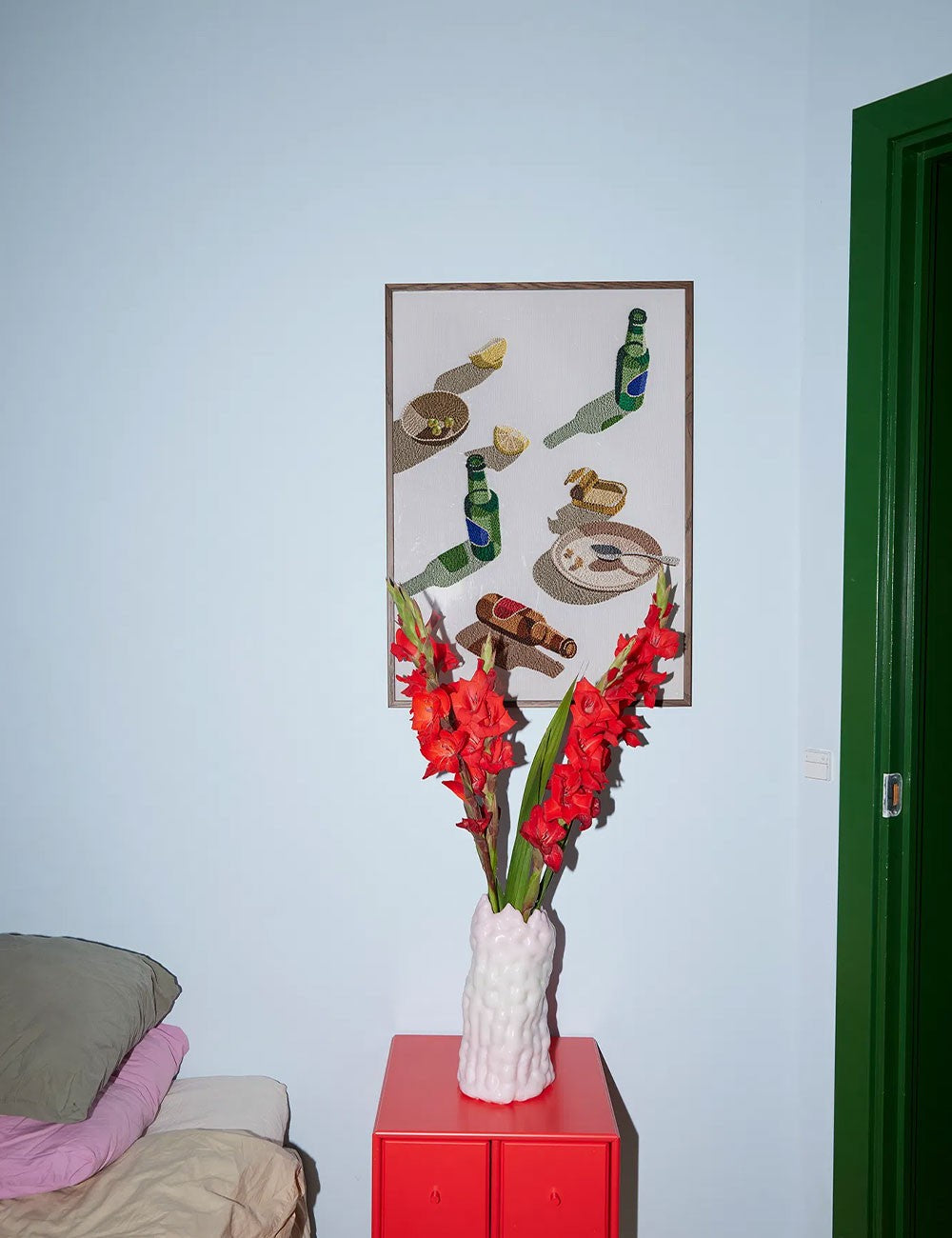 Utilizzando la tecnica del ricamo punch needle, l'artista trasforma le sue fotografie di viaggio in ricami materici e colorati, preservando ricordi fugaci ed evocando un'atmosfera di sogno e intimità. Ogni opera è un omaggio alle icone culturali, ai paesaggi e ai gesti semplici che definiscono la nostra memoria emotiva.