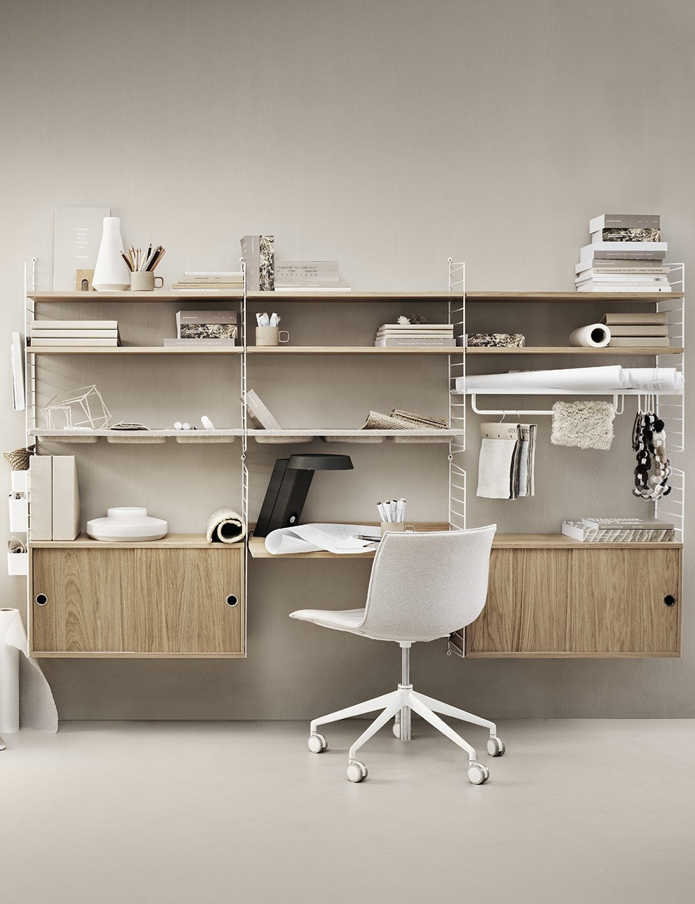 Algunas cosas se asocian tan fuertemente con un momento específico que en realidad terminan siendo atemporales. Esa es una forma de resumir la contribución de Nisse y Kajsa Strinning a la historia del diseño escandinavo. La editorial sueca Bonnier se dio cuenta que la mayoría de los hogares no estaban amueblados adecuadamente, prestando atención a las estanterías, lo que les dificultaba mucho vender libros. En 1949 anunciaron un concurso en el que pedían un diseño para un estante con algunos criterios. El estante tenía que ser asequible, fácil de enviar e, igualmente, fácil de montar. Naturalmente, String se convirtió en una solución muy común en los hogares suecos durante la década de 1950 y 1960. Durante varios años, la producción de String fue inexistente. No fue hasta el 2004 cuando la marca revivió con un nuevo concepto adaptado a las necesidades de hoy en día. Nisse Strinning contribuyo al renacimiento de su propia marca con un nuevo diseño llamado String Pocket que se convirtió inmediatamente en un éxito y sigue siendo uno de los productos estrella de la marca en la actualidad.