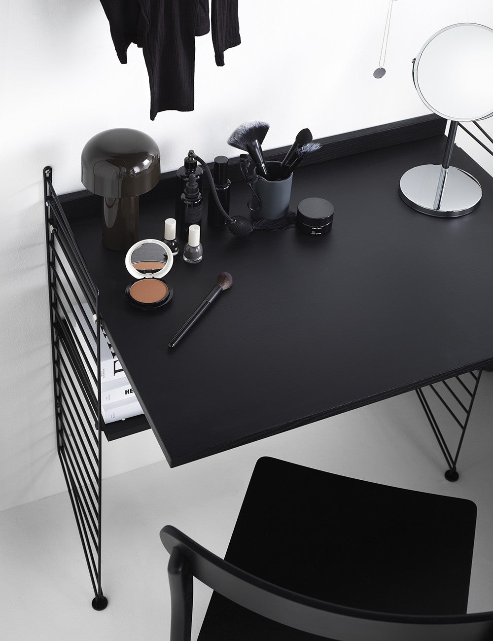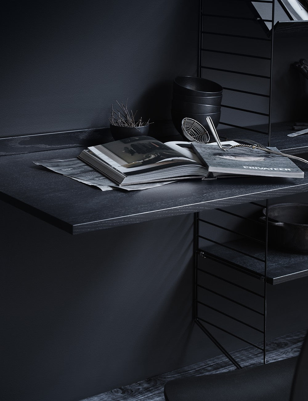 Ogni scrivania String è composta da un piano di lavoro e da un ripiano che viene posizionato contro il muro per stabilizzare la scrivania insieme alle staffe.