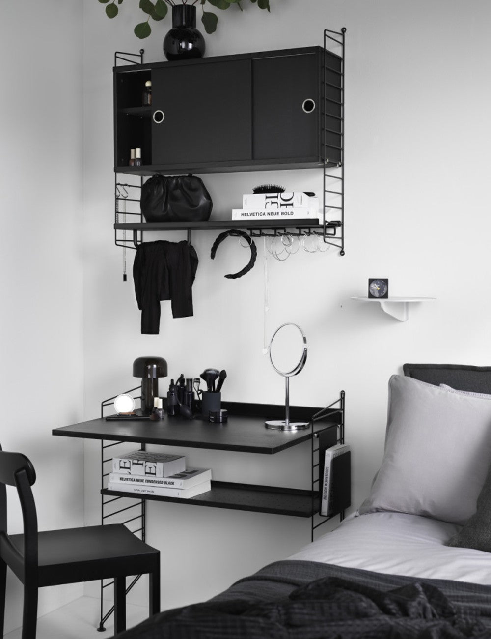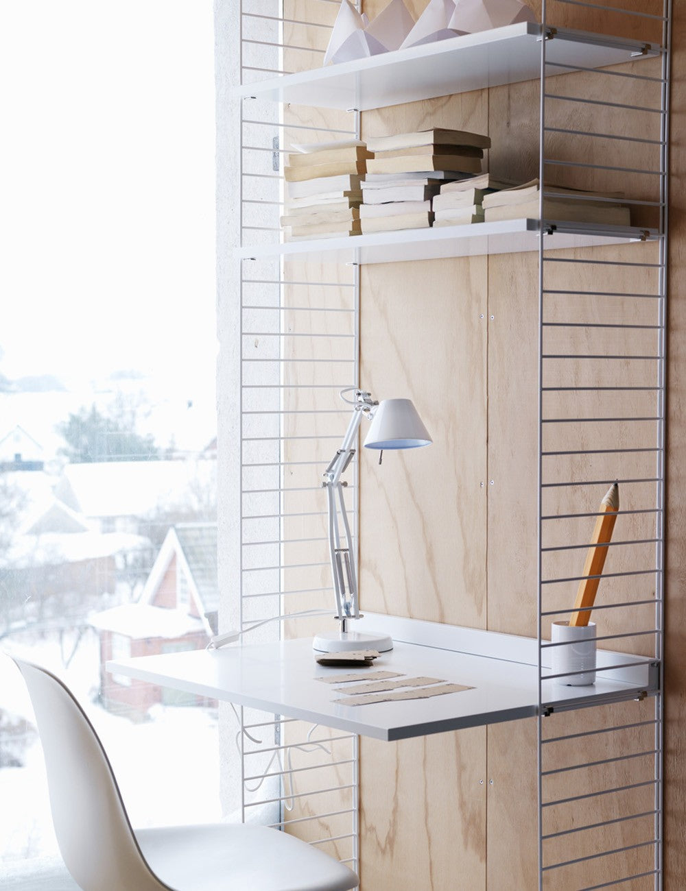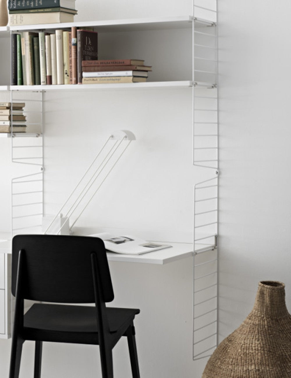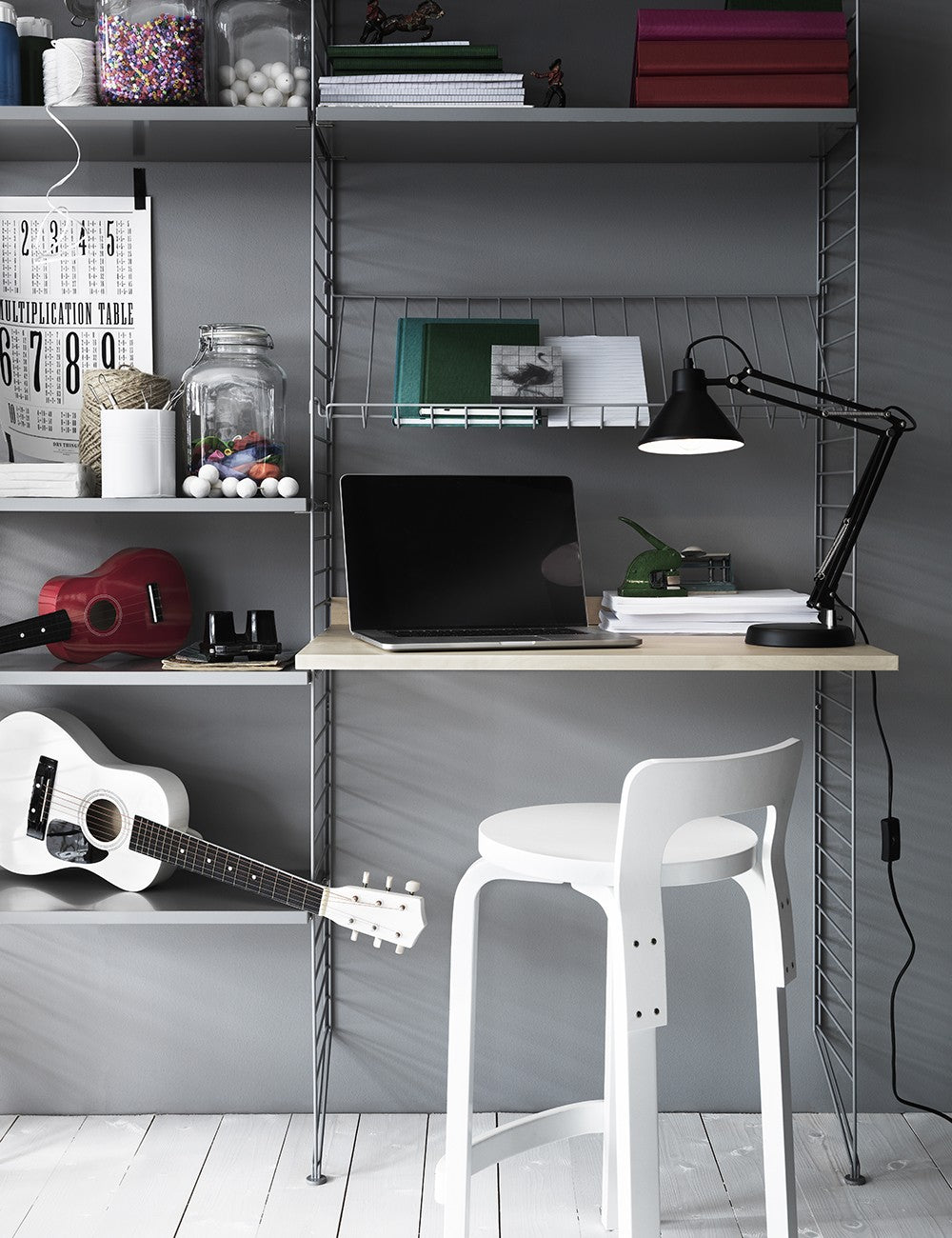 Ogni scrivania String è composta da un piano di lavoro e da un ripiano che viene posizionato contro il muro per stabilizzare la scrivania insieme alle staffe.