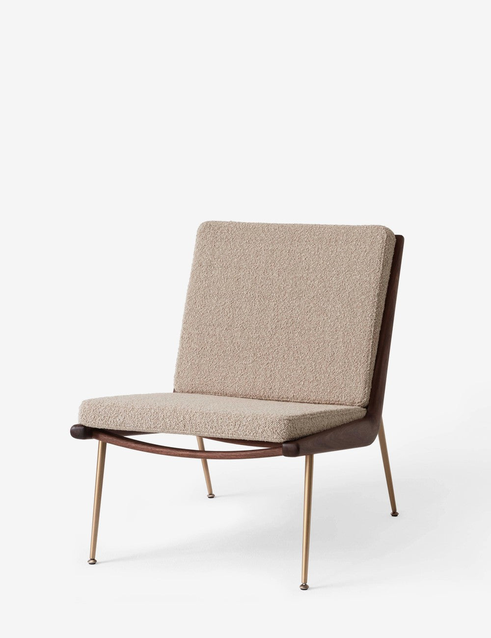 Design puro e semplice, in cui la struttura in legno lucidato a mano, le gambe leggere e i dettagli in ottone sul retro dello schienale rendono Boomerang una poltrona estremamente comoda ed elegante.
