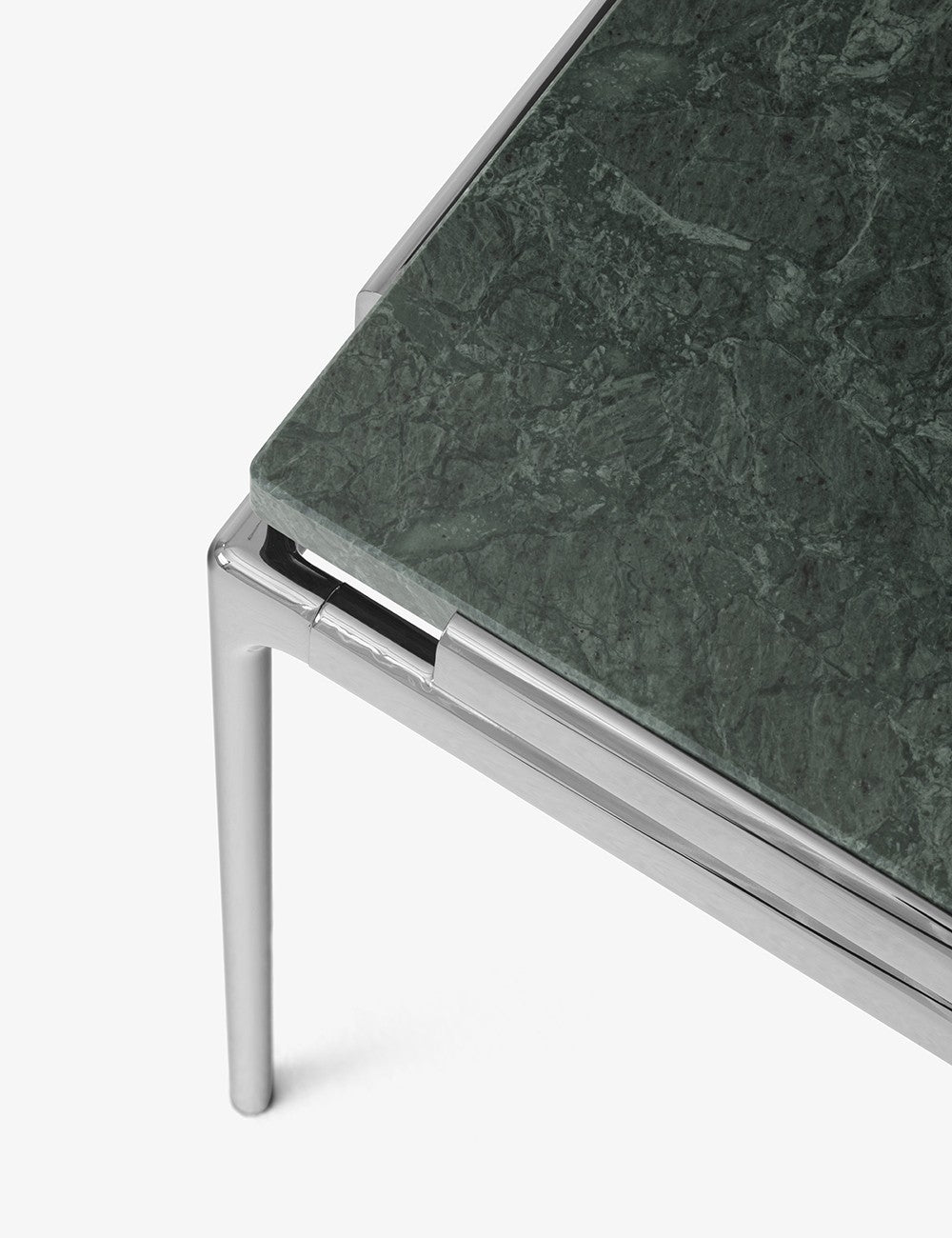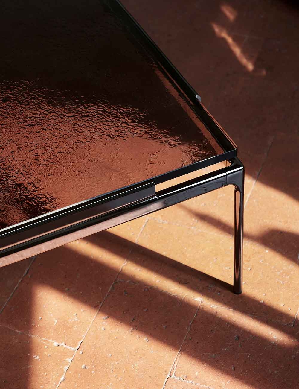Sett è disponibile in diverse misure con piano in marmo Verde Guatemala, marmo Bianco Carrara o vetro fuso.