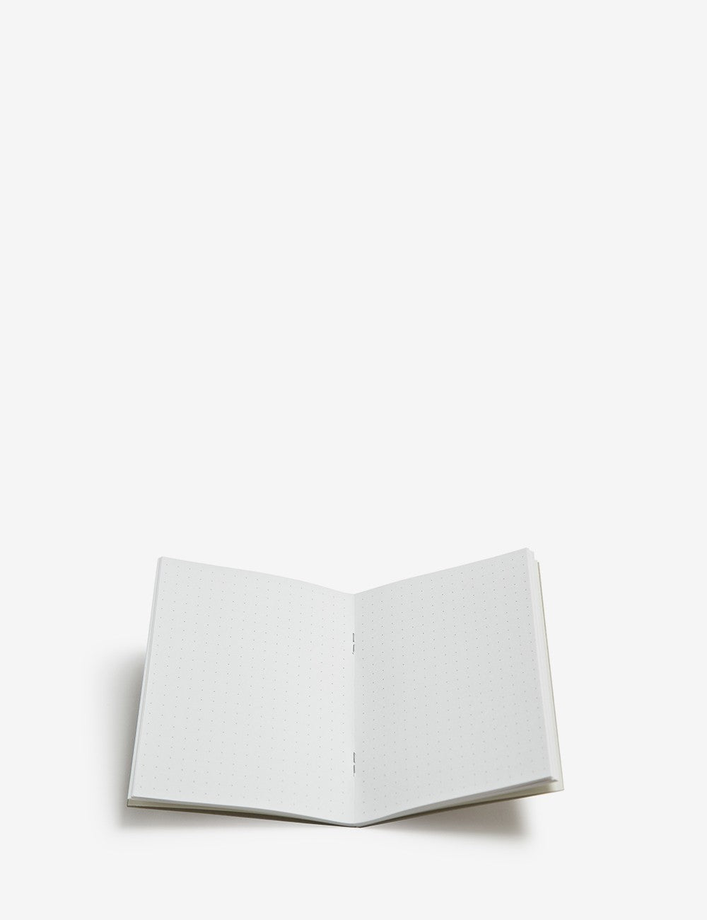 Nella ricarica 014 troverete un quaderno spillato con copertina rigida beige e 64 pagine bianche con un disegno a griglia punteggiata distanziata di 5 mm.