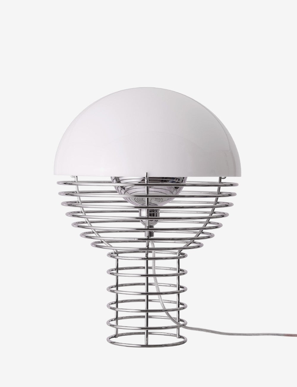 La lampada da tavolo Wire è caratterizzata da una struttura in filo d'acciaio cromato che si allarga nella parte superiore per sostenere un paralume semisferico in plastica arancione. La struttura aperta conferisce un aspetto distintivo, leggero e discreto, esaltandone il carattere scultoreo. Nella sua versione piccola, mantiene lo stile industriale ed è perfetta per una scrivania o un comodino. Il tocco di colore completa il design e sottolinea il DNA Panton. Disponibile in varie dimensioni e colori per adattarsi a diversi spazi e stili.
