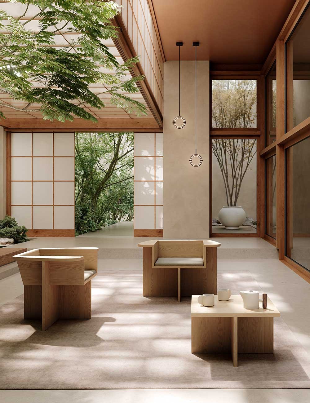 Con un sillón, una mesa de centro y dos sillas de comedor, cada pieza está cuidadosamente elaborada para mostrar la interacción entre la fuerza arquitectónica y la calidez orgánica.