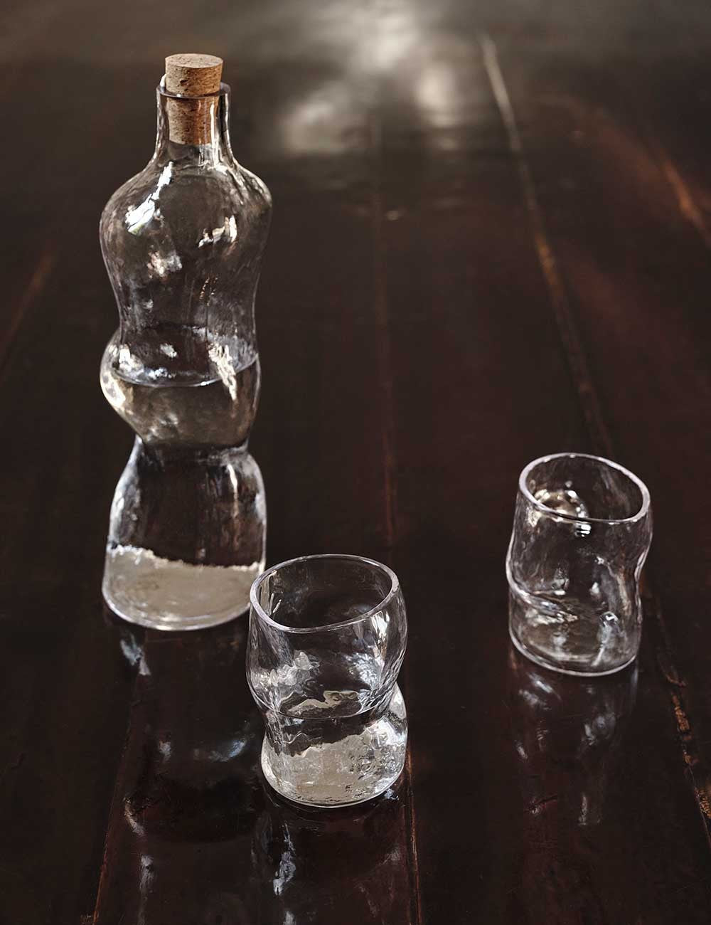 La serie Dimple se inspira en la palabra que le da nombre, que significa ranura o hendidura, dando como resultado una botella y unos vasos de carácter orgánico.
