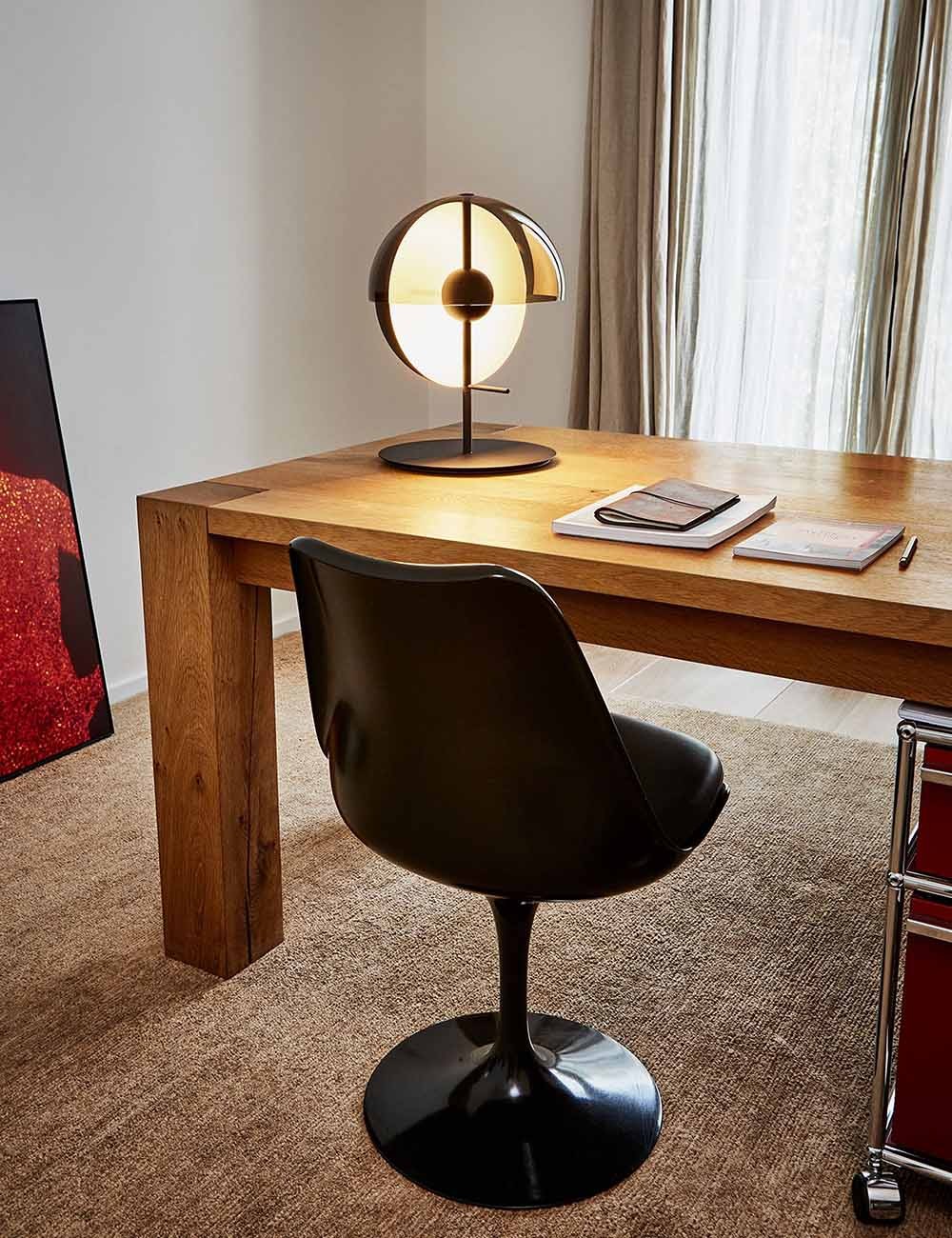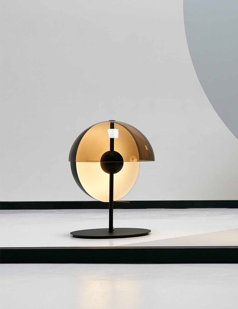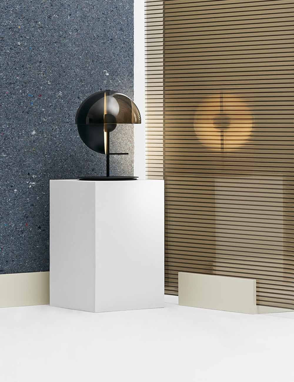 Theia tiene dos caras, solo hay que girarla suavemente sobre su eje. Se puede dirigir hacia el usuario y funciona como una lámpara para leer, o bien hacia un objeto o una pared, creando un sutil efecto de luz indirecta que aporta calidez. Este giro cambia completamente la percepción de la pieza, ya que su difusor metálico es totalmente opaco.