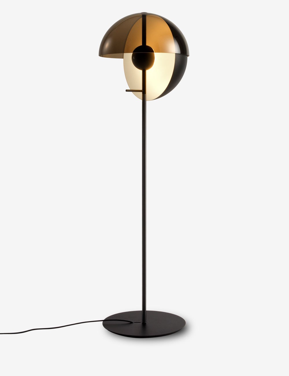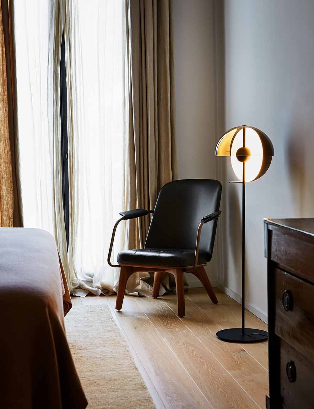 Theia tiene dos caras, solo hay que girarla suavemente sobre su eje. Se puede dirigir hacia el usuario y funciona como una lámpara para leer, o bien hacia un objeto o una pared, creando un sutil efecto de luz indirecta que aporta calidez. Este giro cambia completamente la percepción de la pieza, ya que su difusor metálico es totalmente opaco.