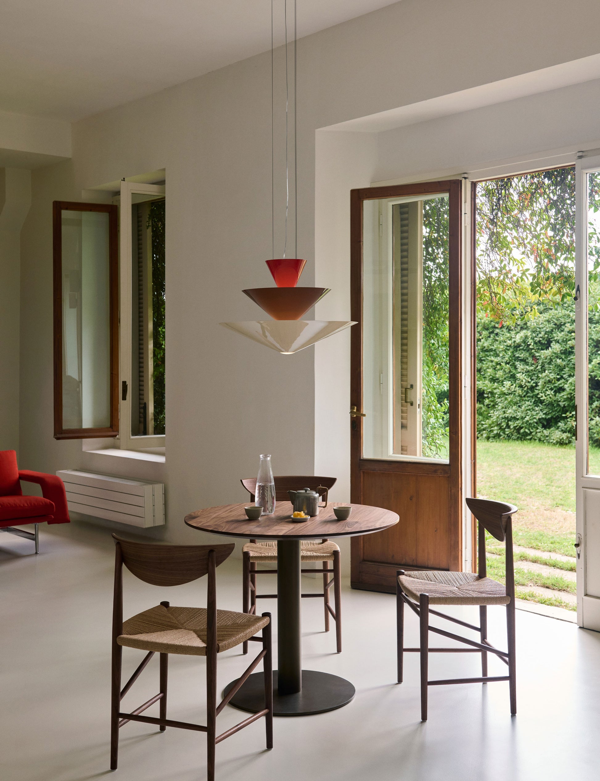 La forma cónica de las pantallas de hilo de aluminio rinde homenaje al maestro Gio Ponti y a su legado, especialmente en sus icónicas lámparas de Murano.