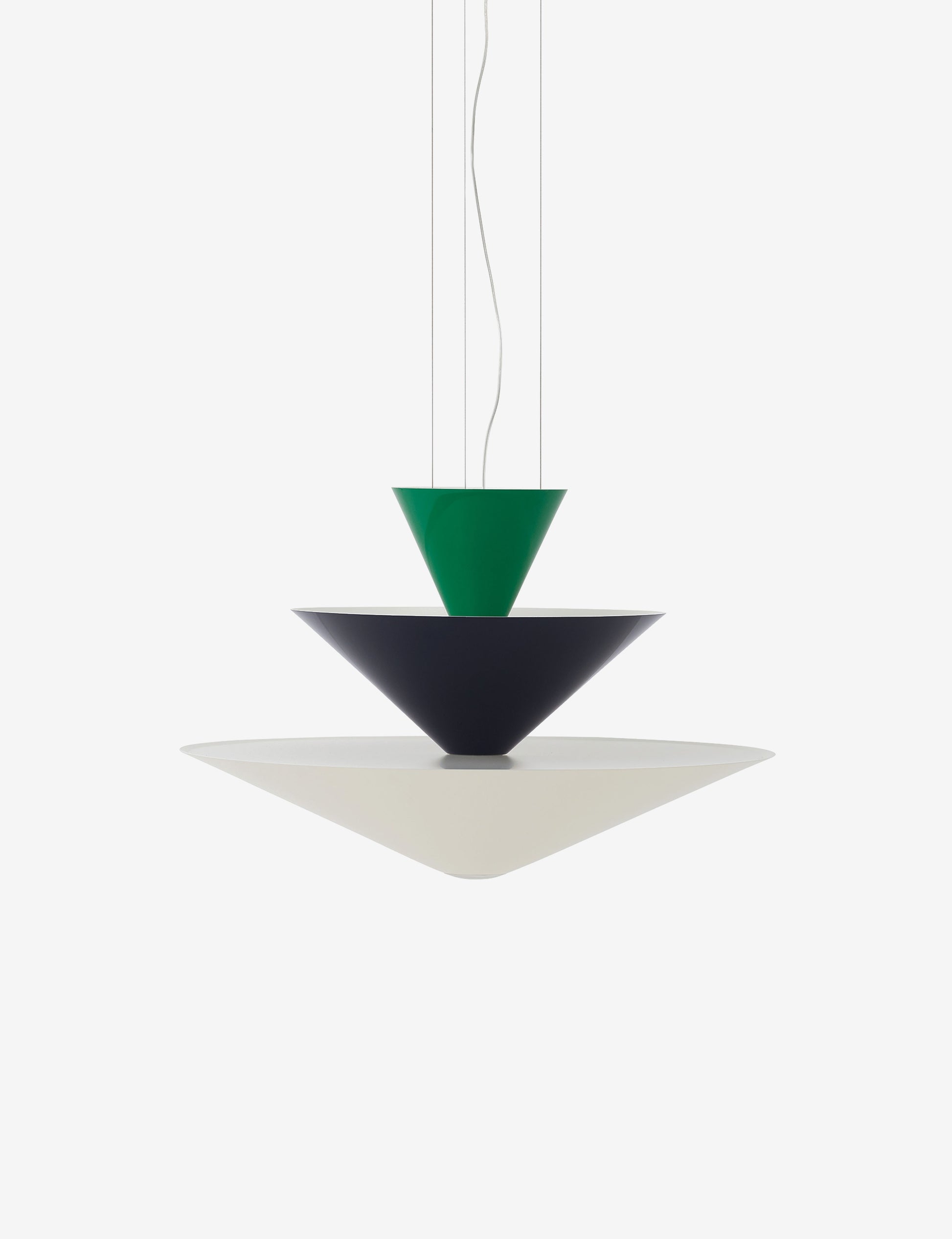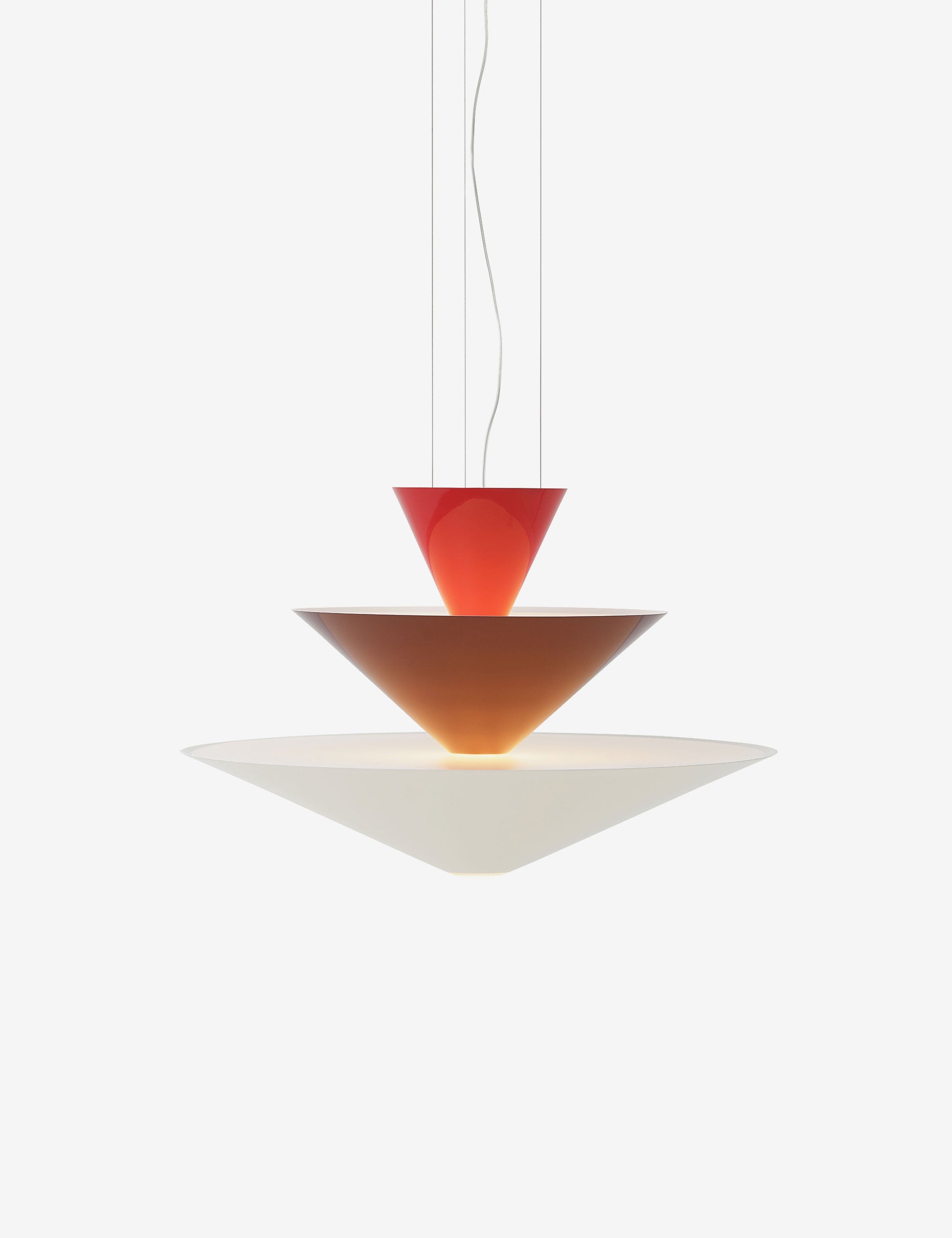 La lámpara funciona como una luz ascendente que emite suavemente desde dos niveles hacia su entorno y como una luz descendente, con un orificio en la punta del cono mayor que dirige la luz hacia la superficie inferior.