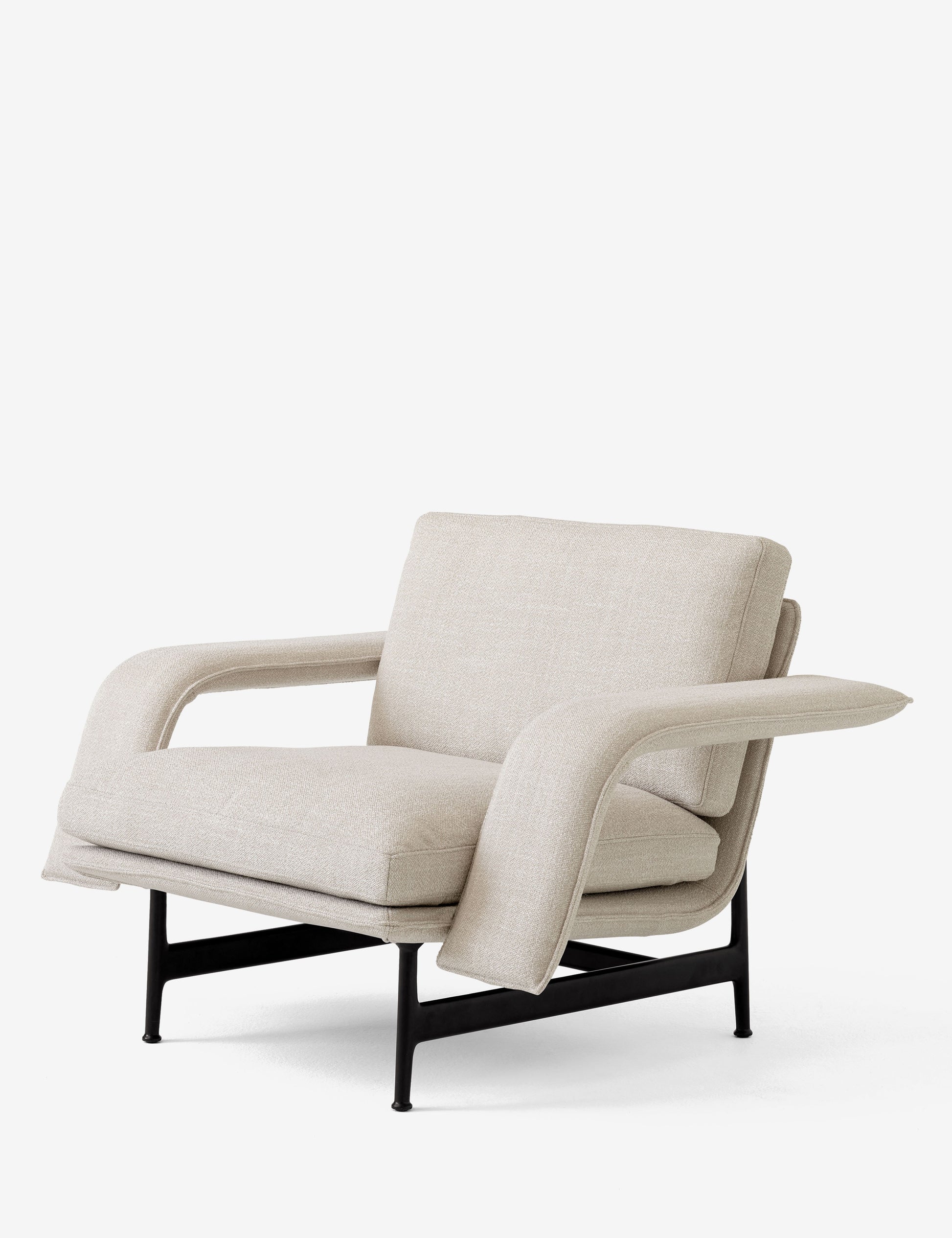 La forma de Meantime, con brazos anchos y delgados, recuerda a los muebles que se encuentran en los espacios liminales de las salas de espera de los transportes, piezas creadas a menudo por arquitectos y diseñadores para integrarse discretamente en su entorno, al tiempo que proporcionan comodidad a los viajeros o a quienes están de paso.