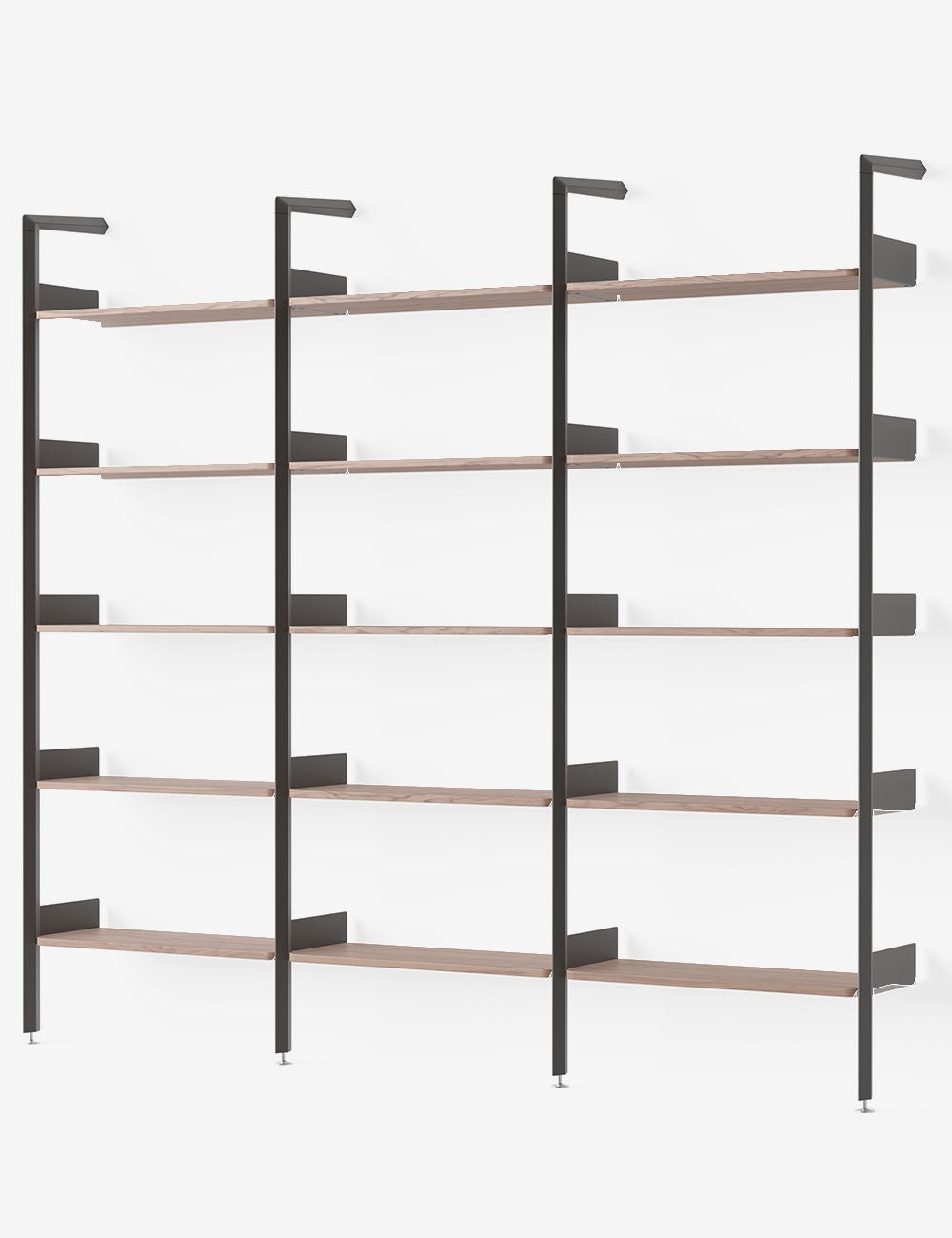 Los estantes se presentan tanto en chapa de acero cortada y conformada por tecnología láser, como en tablero de base de madera recubierto con chapa de roble o nogal.
