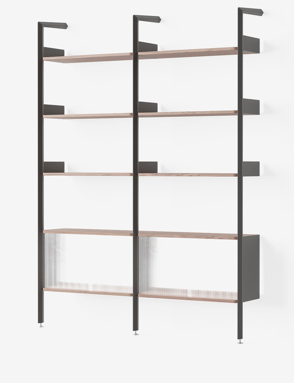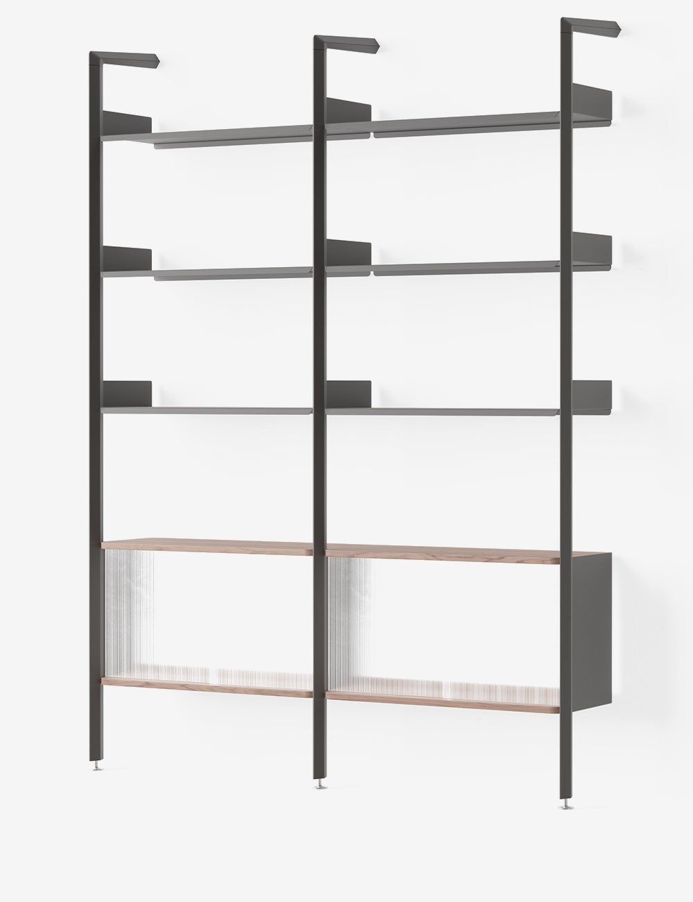 Los estantes se presentan tanto en chapa de acero cortada y conformada por tecnología láser, como en tablero de base de madera recubierto con chapa de roble o nogal.