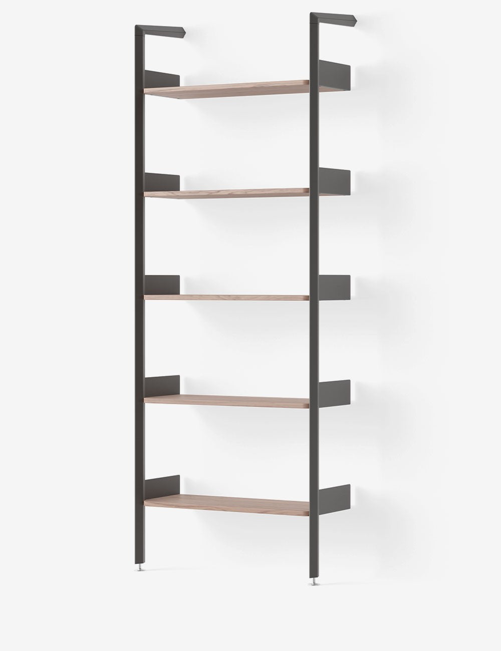 Los estantes se presentan tanto en chapa de acero cortada y conformada por tecnología láser, como en tablero de base de madera recubierto con chapa de roble o nogal.