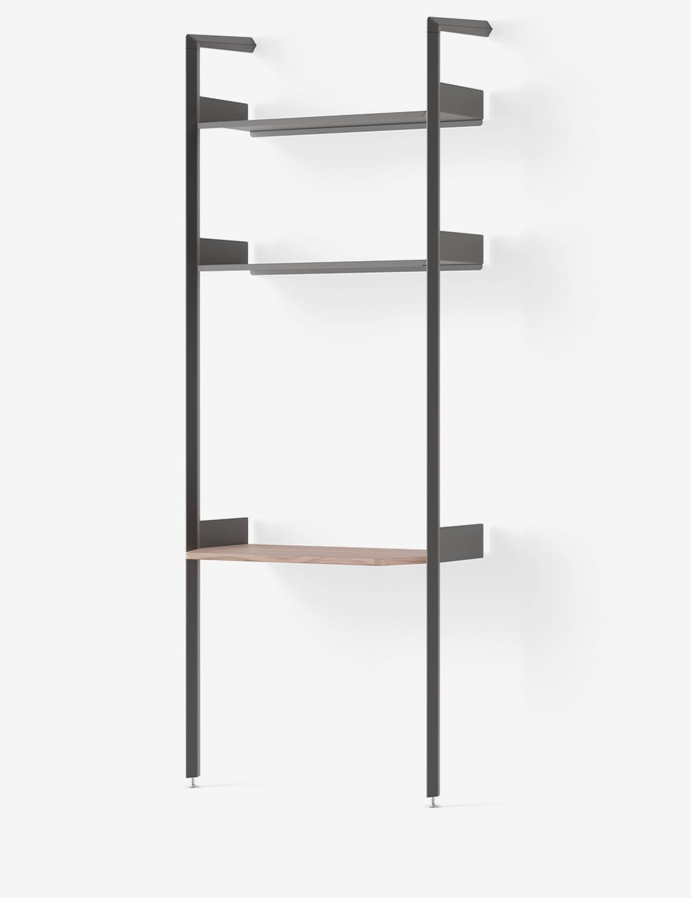 Los estantes se presentan tanto en chapa de acero cortada y conformada por tecnología láser, como en tablero de base de madera recubierto con chapa de roble o nogal.
