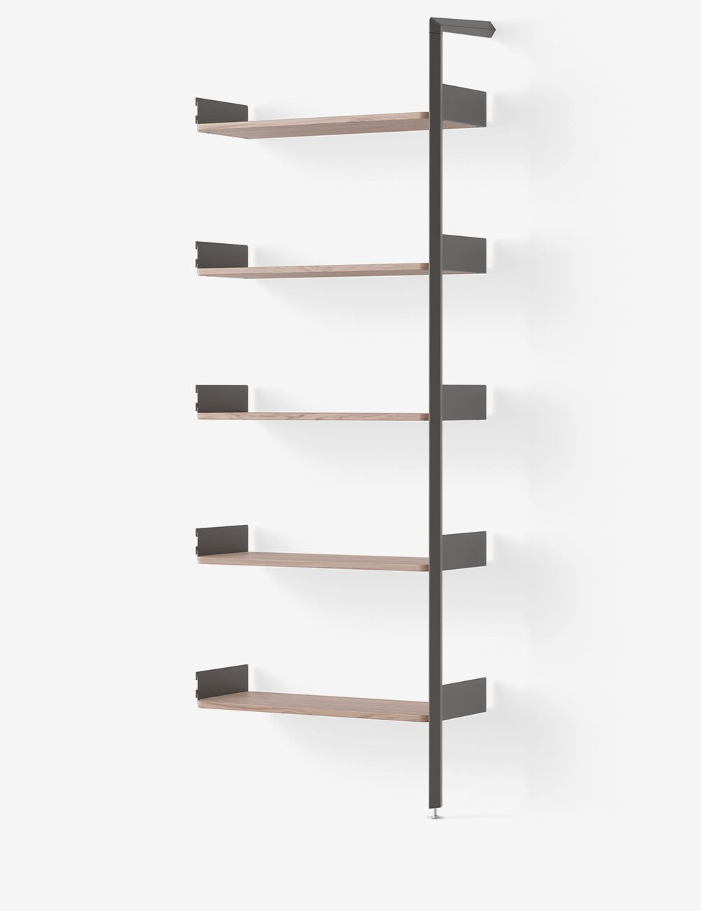 Los estantes se presentan tanto en chapa de acero cortada y conformada por tecnología láser, como en tablero de base de madera recubierto con chapa de roble o nogal.