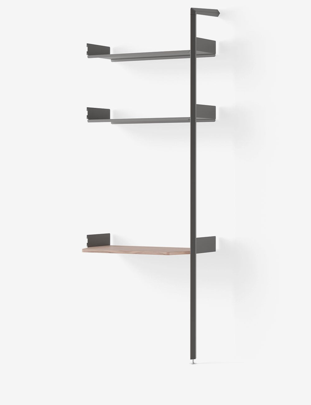 Los estantes se presentan tanto en chapa de acero cortada y conformada por tecnología láser, como en tablero de base de madera recubierto con chapa de roble o nogal.