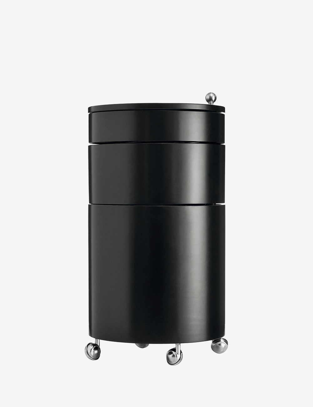 Barboy es a la vez mesa auxiliar adaptable y unidad de almacenaje móvil. Diseñado por Verner Panton en 1963 y reeditado por VERPAN, integra tres cajones circulares que se extraen por completo, de modo que toda la superficie queda utilizable. El contraste entre la superficie mate y los detalles en cromo —tirador y ruedas— aporta un toque elegante y distintivo, fiel al lenguaje de Panton. Su diseño funcional y escultórico lo convierte en una pieza versátil para salón, dormitorio, estudio o espacios de hostelería.